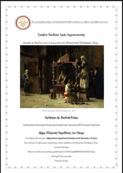 09/04/2021 09/04/2021   The Archdiocesan Office of Greek Education kindly invites you to an online Paschal talk by Dr Vasiliki Kouma – head of the Cypriot Education Mission – on the theme of ‘Greek Easter Traditions.’ This will take place on Monday the 19th of April 2021 at 6:00pm, through Zoom. The esteemed speaker will talk on...