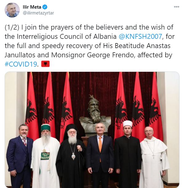 Presidenti i Republikës, Ilir Meta i është bashkuar sot lutjeve të besimtarëve dhe urimit të Këshillit Ndërfetar të Shqipërisë, për shërim të plotë dhe të shpejtë të Fortlumturisë së Tij Anastas Janullatos dhe Imzot George Frendos, të prekur nga COVID-19.