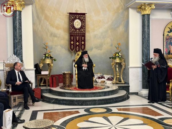 Also, let me raise a toast to the health of all the Hierarchs, clergy, and distinguished guests present, and especially of those who had come from the beloved homeland, His Excellency the Minister of Foreign Affairs, Mr. Gerapetritis; Her Excellency the Deputy Minister of Culture of Cyprus, Mrs. Kassianidou; the Secretary General for Religious Affairs, Mr. Kalantzis, together with their associates; the Consul General of Greece in Jerusalem, Mr. Dimitrios Angelosopoulos, with his staff; and the Ambassador of Egypt to Ramallah, Mr. Ihab Solimen.”