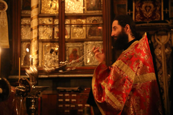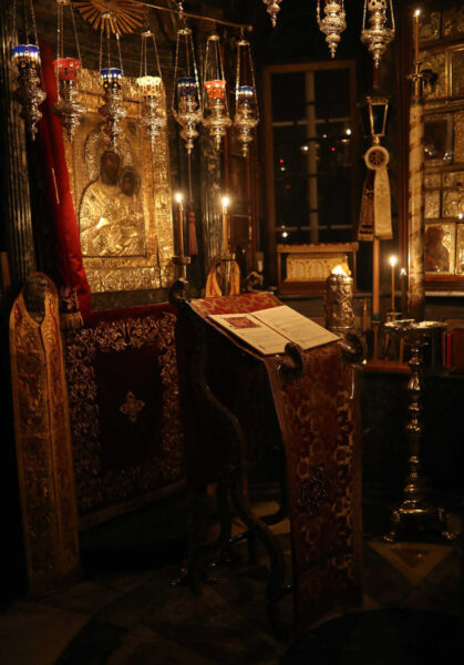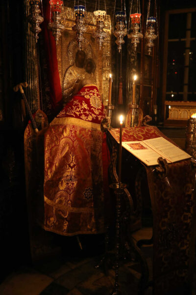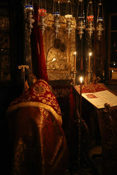 After a litany held by the citizens of the town on the walls of the city, having in front the icon of Mother of God, a sudden hurricane dispersed the fleet of the enemy, casting the vessels on the shore near the Great church of the Mother of God at Blachernae, with a quarter of Constantinople located inside the Golden Horn. The account says that the people spent the whole night, thanking the Virgin Mary for the unexpected deliverance. The words Ἀκάθιστος Ὕμνος in Greek means “unseated hymn” (hymns while standing, not sitting down).
