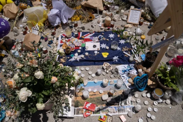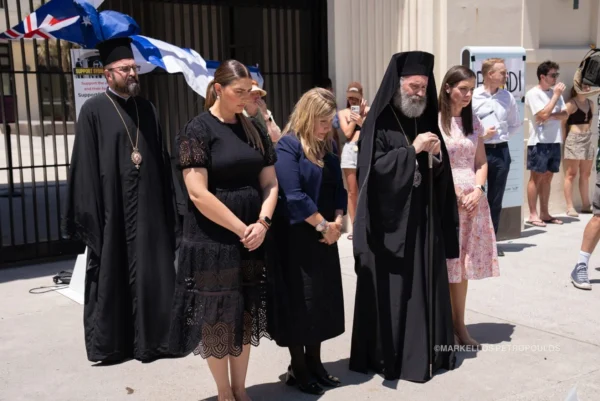Accompanied by His Grace Bishop Christophoros of Kerasounta, Chancellor of the Holy Archdiocese, His Eminence laid flowers at the memorial that has been created at the site of the tragedy as a spontaneous expression of respect by the people of Australia in memory of the victims. Also present were the NSW Minister for Industrial Relations and Work Health and Safety, The Hon. Sophie Cotsis MP; the NSW Minister for Finance, Domestic Manufacturing and Government Procurement, and Natural Resources, The Hon. Courtney Houssos; and NSW Member of Parliament Ms Eleni Petinos.