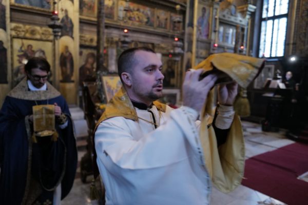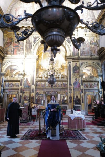 Following the Divine Liturgy at the Cathedral of Saint George of the Greeks, the sacred Service of the Blessing of the Waters was celebrated, with the casting of the Holy Cross into the canal from the Bridge of the Greeks (Ponte dei Greci), for the sanctification of the waters of the city of Venice.