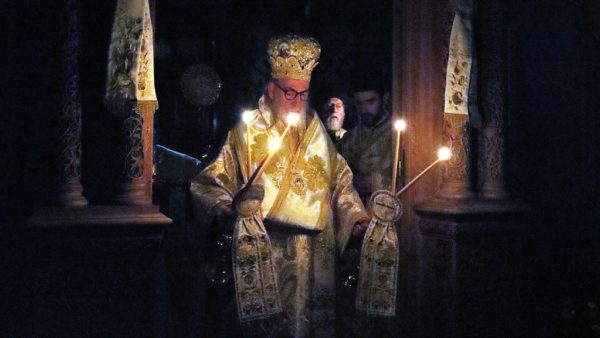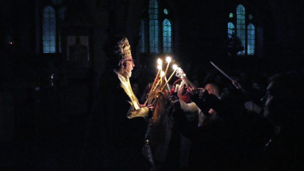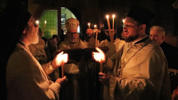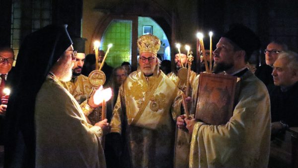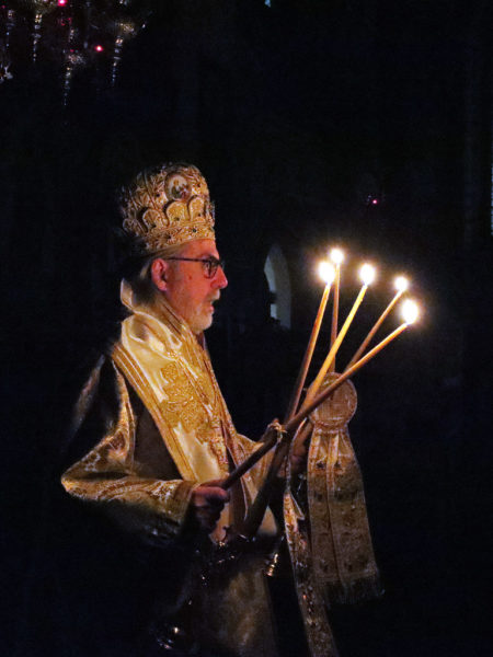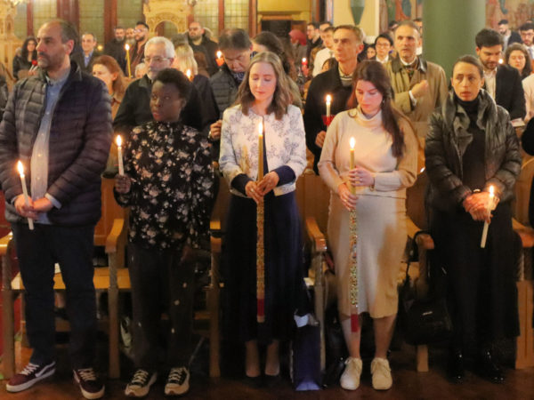 In a jubilant atmosphere, His Eminence Archbishop Nikitas of Thyateira and Great Britain presided over the Service of the Resurrection and celebrated the Paschal Divine Liturgy at the Church of St Andrew in Kentish Town, London. His Eminence was accompanied by the V. Revd Archimandrite Chrysostomos Michaelides and the Revd Oeconomos Father Kristian Akselberg, who is the Priest-in-Charge. The service was further graced by the presence of the Revd Archdeacon George Tsourous, along with Revd Deacons Dimitrios Mamouchas and Georgios Ntallas, who also served during the service.