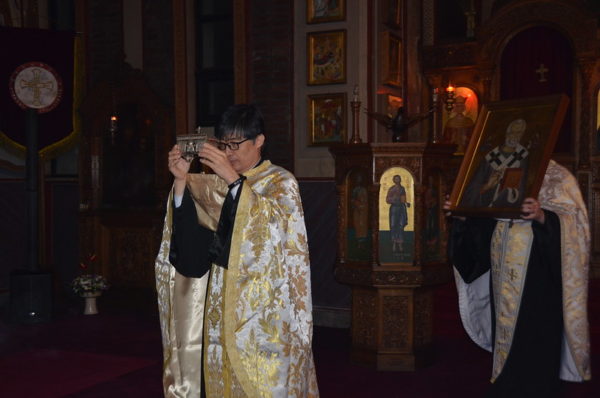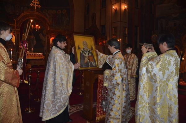 Just before the Dismissal, the clergy and the people knelt in prayer before the Icon of St. Nicholas and His miraculous Holy Relics and recited a special prayer for deliverance from the coronavirus and for the health of the whole world.