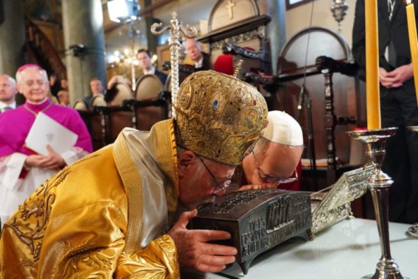 At the moment of “Let us love one another”, the Pope descended from the Antithronon and the Ecumenical Patriarch exited the Holy Altar; the two exchanged the kiss of peace, followed by Pope Theodoros of Alexandria.