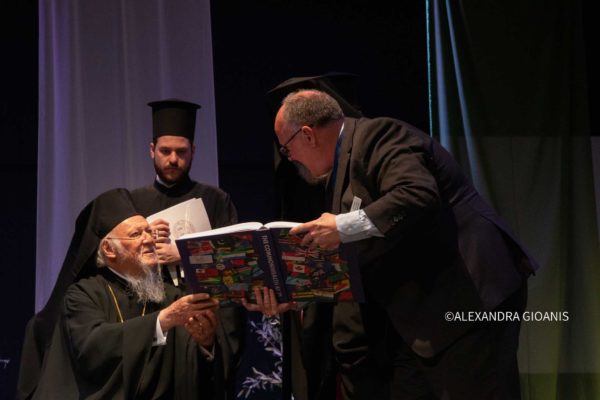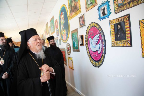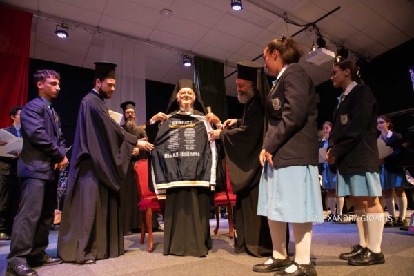 Upon arriving at the entrance of the College, the Patriarch was moved to see his face depicted on a large mural, while the students warmly welcomed him with drum rolls and traditional dances from his birthplace, Imbros. After touring the school facilities, he visited the renovated Sports and Arts Centre, where student works on the themes of the environment and migration were on display. Additionally, His All-Holiness unveiled a mosaic depicting the school’s patron, St John the Forerunner, as well as commemorative plaques in honour of his visit. He then took pride in listening to the school’s Byzantine Choir, which chanted ecclesiastical hymns, and watched a touching musical and theatrical performance in which the children re-enacted aspects of the lives of their immigrant grandparents in the fifth continent.