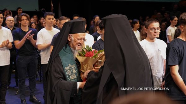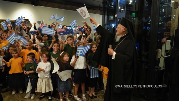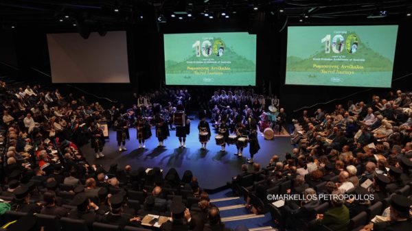 The ceremony’s opening was particularly impressive as the Ecumenical Patriarch, following his formal entrance into the auditorium, was welcomed with cheers and songs by young members of the Greek diaspora and greeted with drum rolls and the sounds of a Scottish bagpipe played by members of the historic “Sydney Thistle Highland Pipe Band”. Equally impressive and moving was the musical-theatrical performance titled “Echoes of Romiosini” presented by young men and women of the Greek Orthodox Christian Society of Sydney, which concluded the ceremony.