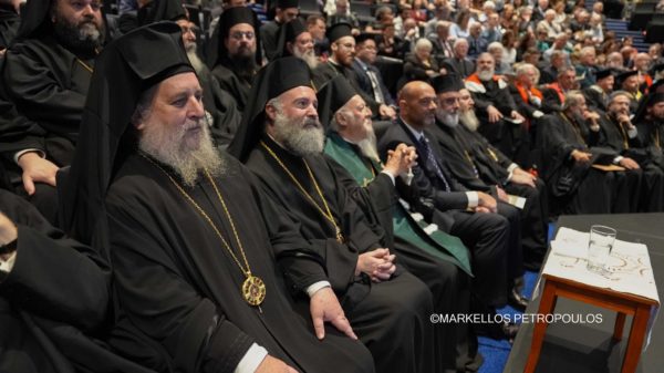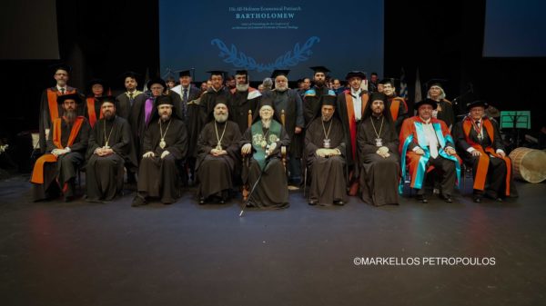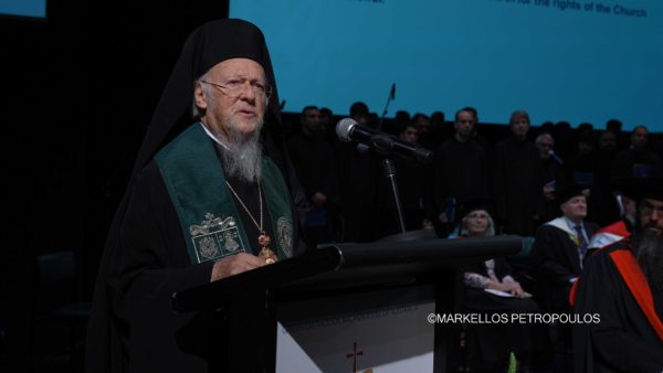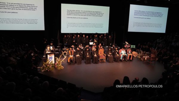 On Saturday 5th October, the chant “Axios” (He is worthy) echoed through the packed central auditorium of the University of Sydney in honour of His All-Holiness Ecumenical Patriarch Bartholomew, who was awarded an Honorary Doctorate by St Andrew’s Theological College, part of the Greek Orthodox Archdiocese of Australia. Present at the grand award ceremony were His Eminence Archbishop Makarios of Australia and members of the Holy Eparchial Synod, Deputy Minister of Culture of Greece Mr Iason Fotilas, representing the Greek Government, hierarchs, clergy, monks and nuns, professors and students of the Theological School, among others.