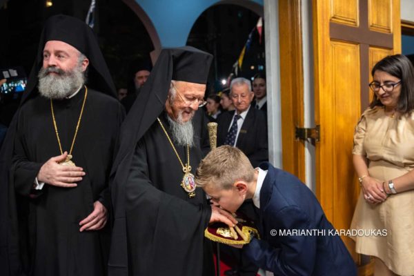 With heartfelt words, His All-Holiness Ecumenical Patriarch Bartholomew addressed his compatriots, the Imbrians of Sydney and New South Wales, during a dinner held in his honour on the evening of Friday, 11th October. The convivial event took place in the hall of the Parish-Community of Saint Euphemia, in the suburb of Bankstown, Sydney. Upon his arrival at the church bearing the same name, the Patriarch was greeted by the youth of the Parish-Community, who offered him a bouquet of flowers and sang the traditional hymn of many years for him. Initially, the Patriarch accompanied by His Eminence Archbishop Makarios of Australia, entered the church where he venerated the holy icon of Saint Euphemia the Great Martyr and a fragment of her relic from the Phanar that was gifted by the late Ecumenical Patriarch Athenagoras a few years after the Parish-Community’s founding in the 1960s.