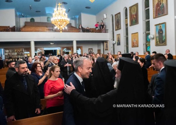 Besides the aforementioned individuals, members of the Patriarchal entourage attended the dinner, including His Eminence Metropolitan Philotheos of Thessaloniki, the Very Reverends Grand Protosyncellus Archimandrite Gregory and Grand Ecclesiarch Archimandrite Aetios, Director of the Personal Patriarchal Office, the Reverend Patriarchal Deacon Evlogios, Codifier of the Holy and Sacred Synod, the Righteous Nun Iakovi, Abbess of the Holy Monastery of St John the Baptist in Akritochori, the Honourable Archon Teacher of the Nation Mr Konstantinos Delikostantis, Director of the First Patriarchal Office, and the Honourable Archon Teacher of the Church Mr Theodoros Yiangou, Professor at the Aristotle University of Thessaloniki, and the Honourable Mr Nicholas-George Papachristou, Director of the Patriarchal Press and Communication Office, as well as Their Eminences, Metropolitan Ezekiel of Dervis and Metropolitan Seraphim of Sevasteia, Their Graces, Bishops of the Holy Archdiocese of Australia and the Consul General of Greece in Sydney, Mr Yannis Mallikourtis.