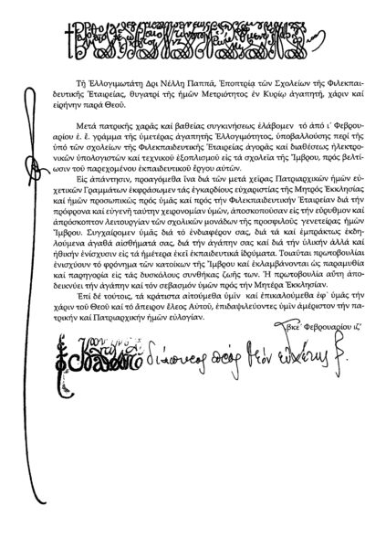 His All-Holiness Ecumenical Patriarch Bartholomew, after being informed of the above by the Superintendent of Schools of the Philekpadeftiki Etaireia (Φιλεκπαιδευτική Εταιρεία, Society for Promoting Education and Learning [SPEL]), Ms. Nelli Pappa, sent the following letter of thanks: