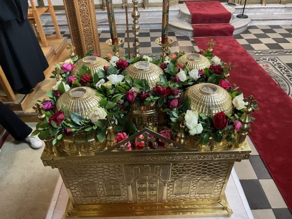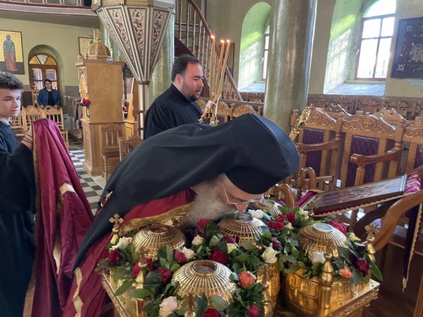 After the Divine Liturgy, a procession with the sacred skulls of the Saints took place throughout the picturesque streets of Chora. The litany stopped at the house of one of the Five Saints and a prayer was made for rain during the current drought. His Eminence then blessed red Paschal eggs and distributed them to the faithful as a blessing.