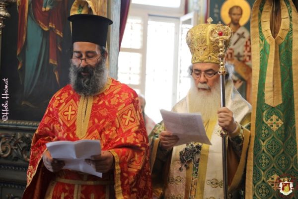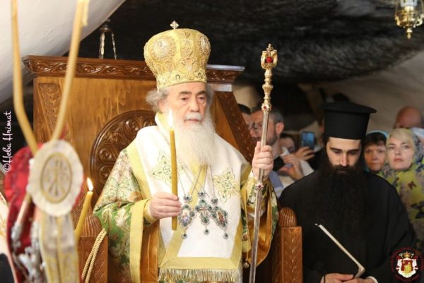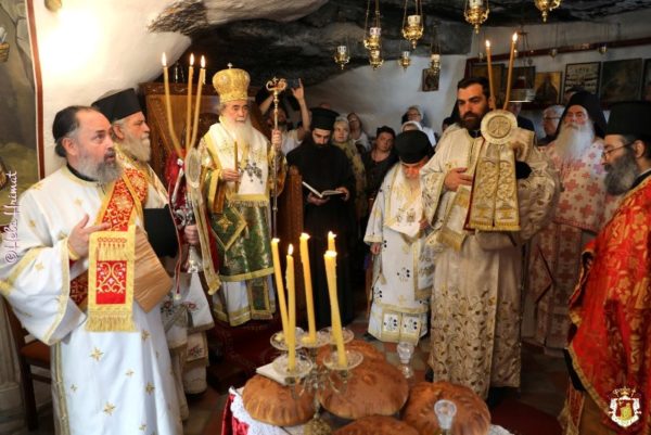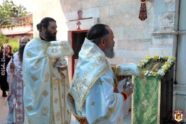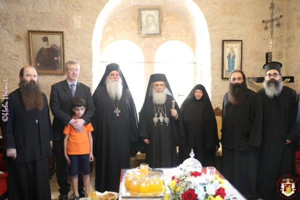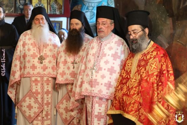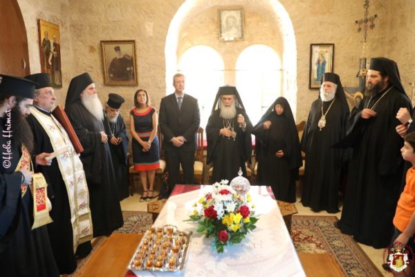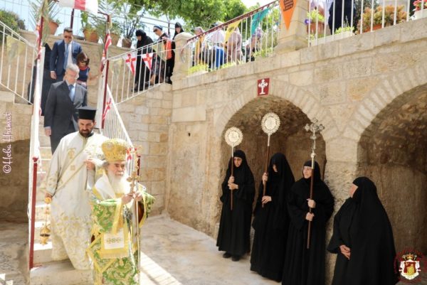 In this ancient Monastery which was renovated by Hagiotaphite Fathers in the 19th and 20th centuries, the Service of Vespers was held by His Eminence Metropolitan Isychios of Kapitolias, and the Divine Liturgy was officiated by His Beatitude our Father and Patriarch of Jerusalem Thephilos, with the co-celebration of their Eminences, Metropolitan Isychios of Kapitolias Archbishop Aristarchos of Constantina, Hagiotaphite Hieromonks and Hieromonks from the Monastery Oblous from the Metropolis of Patra. The chanting was delivered by Hierodeacons Simeon and Dositheos. The service was attended by monks, nuns and faithful Christians from Jerusalem, along with pilgrims from Greece.