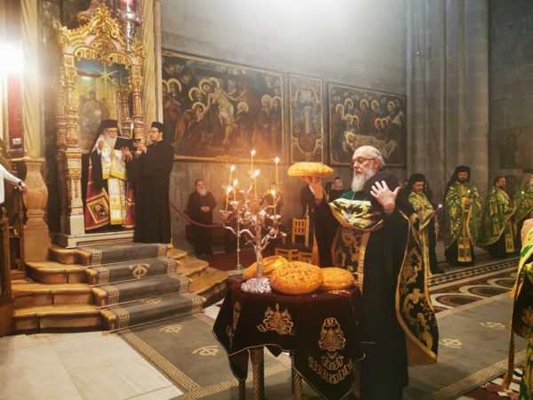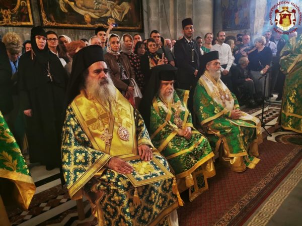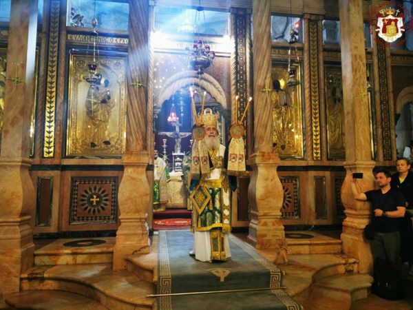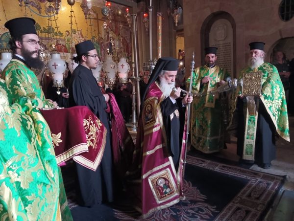 On the day of the feast, the Hagiotaphite Brotherhood went to the Church of the Resurrection, ascended the steps of the Holy Golgotha because of the Easter of the Latins, went to the Catholicon of the Church and celebrated a Patriarchal Divine Liturgy presided over by His Beatitude our Father and Patriarch of Jerusalem Theophilos, with the co-celebration of their Eminences, Metropolitan Isychios of Kapitolias, and the Archbishops, Theophanes of Gerassa, Aristarchos of Constantina, Demetrios of Lydda, Theodosios of Sebasteia and Philoumenos of Pella, the Elder Kamarasis Archimandrite Nectarios, and Priests from many other Orthodox Churches. The service was attended by the Consul General of Greece in Jerusalem Mr Evangelos Vlioras and a large number of pilgrims.