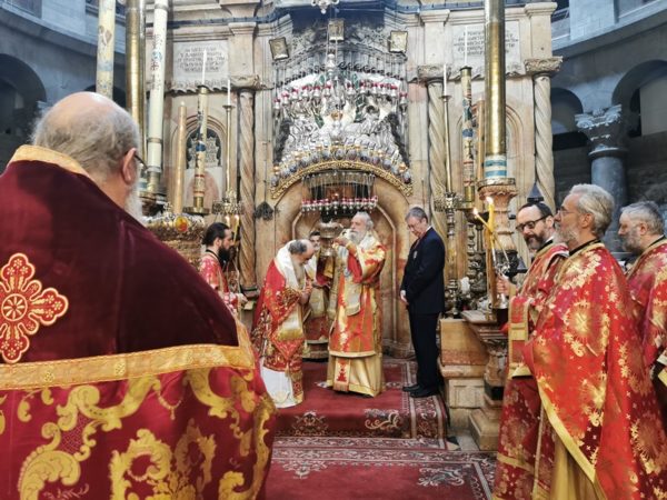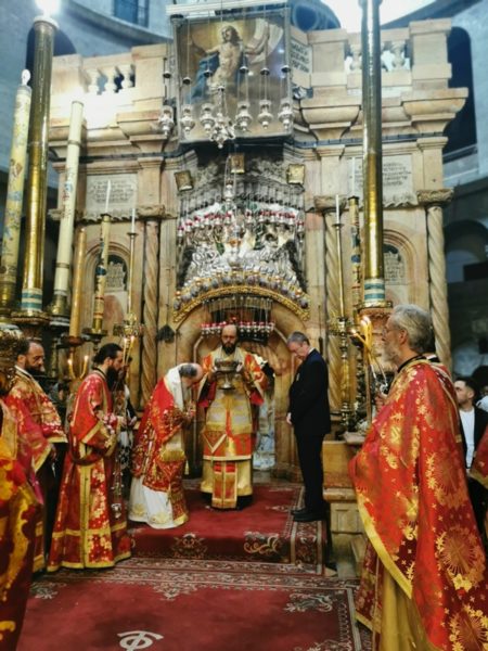 This event was celebrated with a solemn Divine Liturgy at the Holy and Life-giving Sepulchre, which was presided over by our Father and Patriarch of Jerusalem Theophilos, along with their Eminences the Metropolitan Isychios of Kapitolias, the Archbishops Theophanes of Gerassa, Aristarchos of Constantina, Theodosios of Sebasteia, Demetrios of Lydda, two Archbishops of the Serbian Church Damascene and Ioannis, the Elder Kamarasis Archimandrite Nektarios, the Archimandrites Claudios, Nicodemos, Makarios, Hieronymos, Raphael, the Exarch of Athens, Dometian of the Patriarchate of Moscow and John of the Patriarchate of Romania, Fr Anastasios and Priest Nikolaos, other Orthodox Priests, Archdeacon Mark and Hierodeacon Dositheos. The chanting was delivered by Hierodeacon Simeon, as the service was attended by the Consul General of Greece in Jerusalem Mr Evangelos Vlioras and the Consul of Georgia Mr Lhasa and many pilgrims.