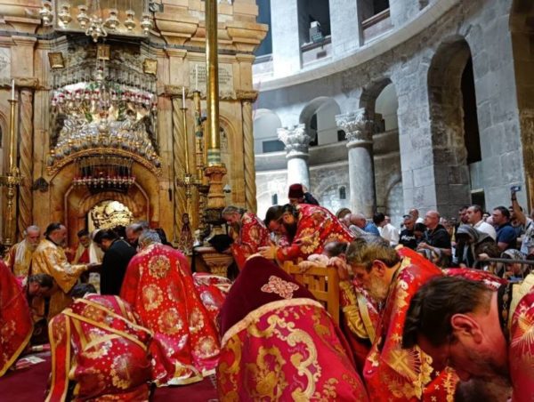 At the Holy Altar of the Catholicon, the Vespers of the Kneeling service was also held at the same time, according to the order kept, for the Holy Sepulchre Fathers staying in the Central Monastery.
