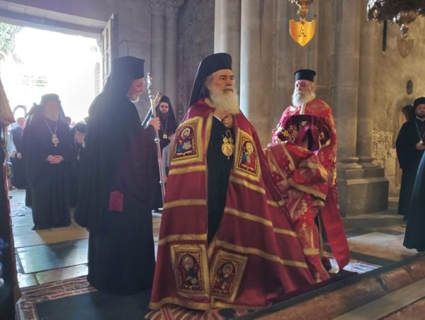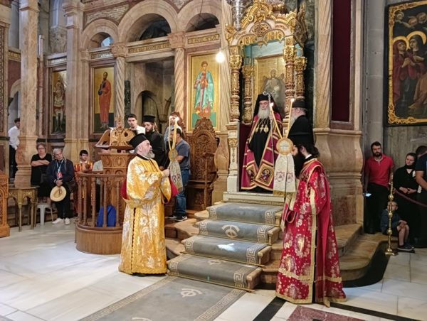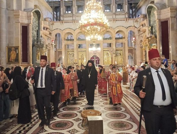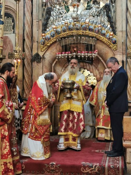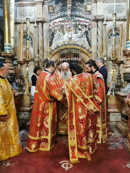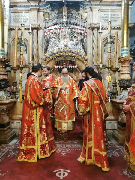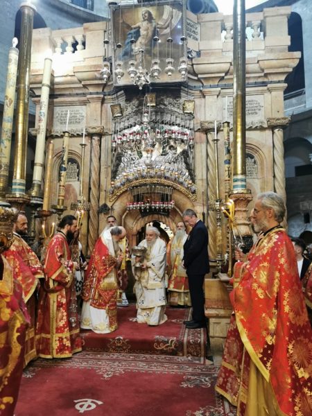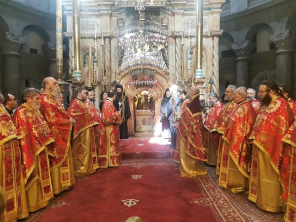 This event was celebrated with a solemn Divine Liturgy at the Holy and Life-giving Sepulchre, which was presided over by our Father and Patriarch of Jerusalem Theophilos, along with their Eminences the Metropolitan Isychios of Kapitolias, the Archbishops Theophanes of Gerassa, Aristarchos of Constantina, Theodosios of Sebasteia, Demetrios of Lydda, two Archbishops of the Serbian Church Damascene and Ioannis, the Elder Kamarasis Archimandrite Nektarios, the Archimandrites Claudios, Nicodemos, Makarios, Hieronymos, Raphael, the Exarch of Athens, Dometian of the Patriarchate of Moscow and John of the Patriarchate of Romania, Fr Anastasios and Priest Nikolaos, other Orthodox Priests, Archdeacon Mark and Hierodeacon Dositheos. The chanting was delivered by Hierodeacon Simeon, as the service was attended by the Consul General of Greece in Jerusalem Mr Evangelos Vlioras and the Consul of Georgia Mr Lhasa and many pilgrims.