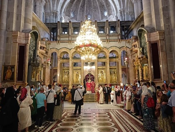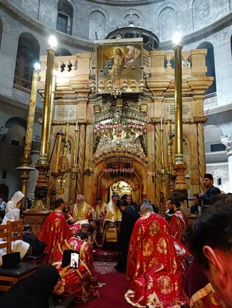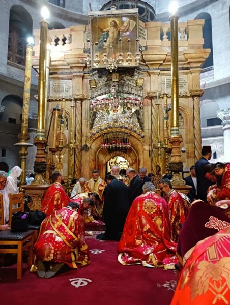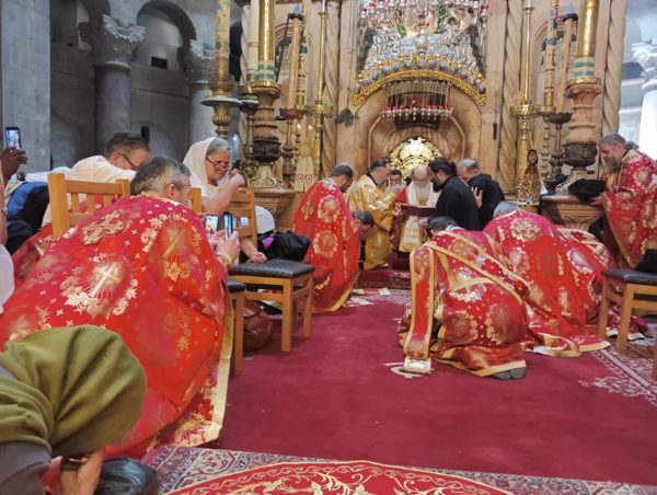 At the Holy Altar of the Catholicon, the Vespers of the Kneeling service was also held at the same time, according to the order kept, for the Holy Sepulchre Fathers staying in the Central Monastery.