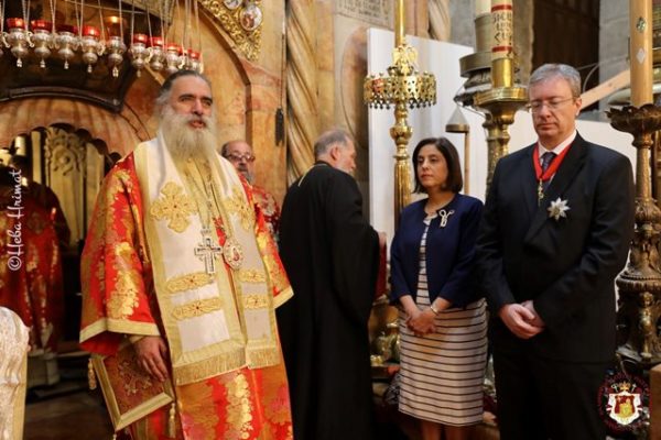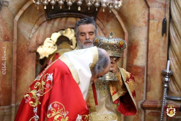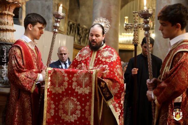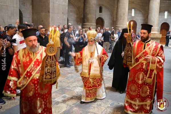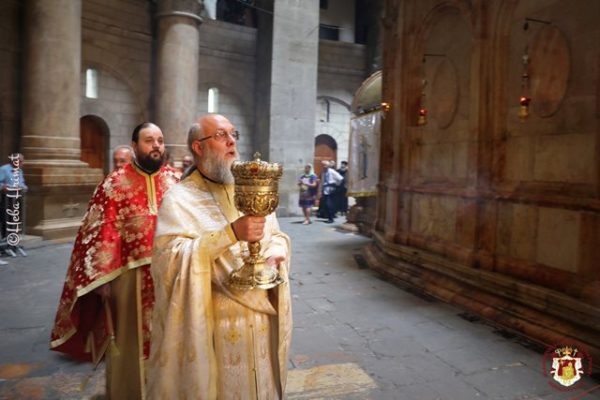 This wondrous event was celebrated on Sunday morning with the Divine Liturgy at the Holy Sepulchre, which was led by His Beatitude our Father and Patriarch of Jerusalem Theophilos with the co-celebration of their Eminences, Metropolitan Isychios of Kapitolias, the Archbishops, Theophanes of Gerassa, Aristarchos of Constantina, Theodosios of Sebastia, Nectarios of Anthedona, Philoumenos of Pella, the Elder Kamarasis Archimandrite Nectarios, Archimandrite Klaudios, Arab-speaking Priests and Priests from Russia, Romania and Georgia. Many faithful Christians attended the Service, as well as the Consul General of Greece in Jerusalem Mr Evangelos Vlioras.