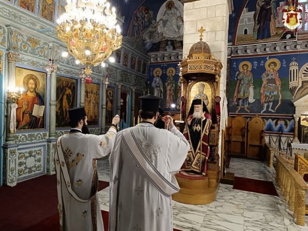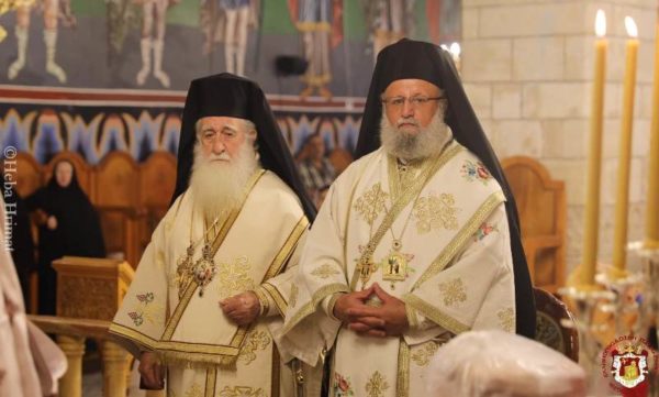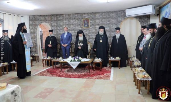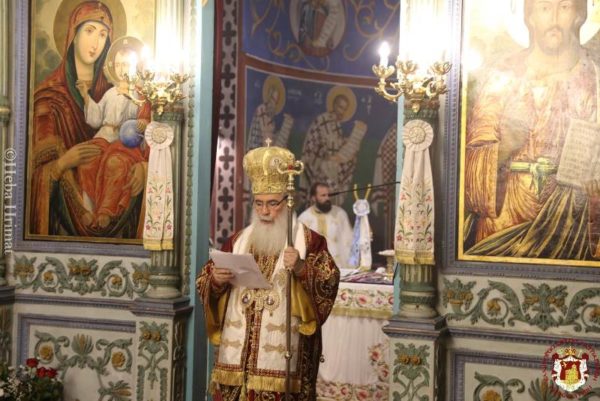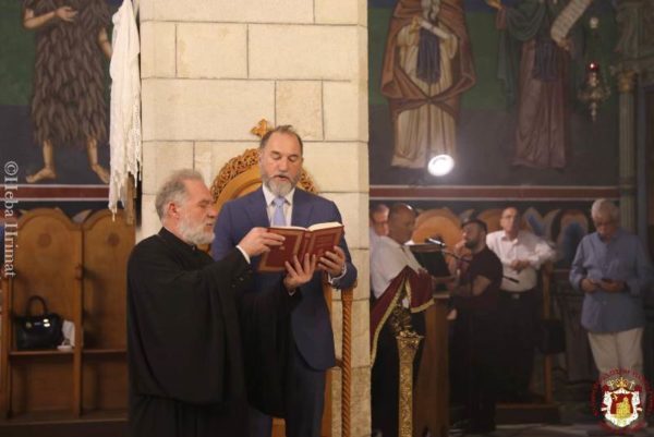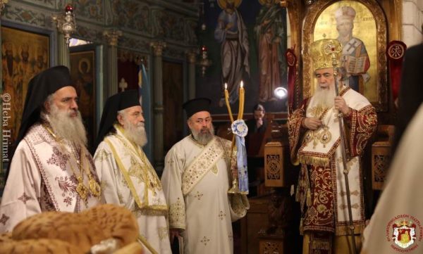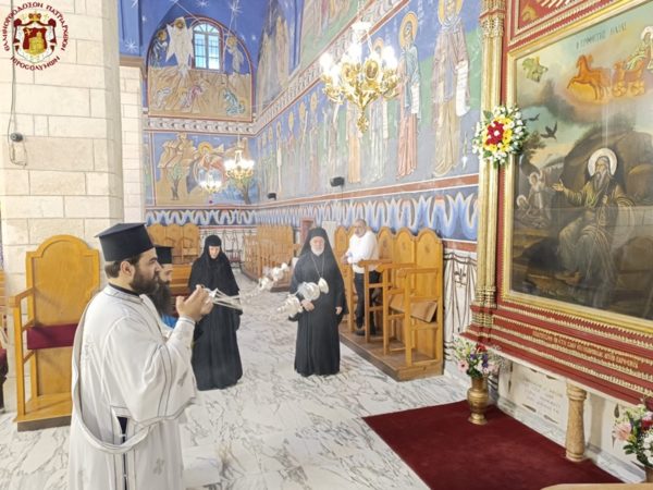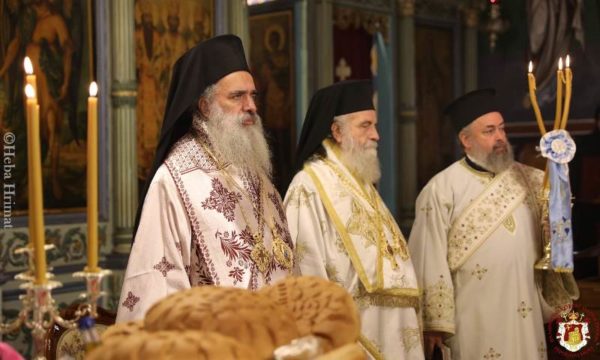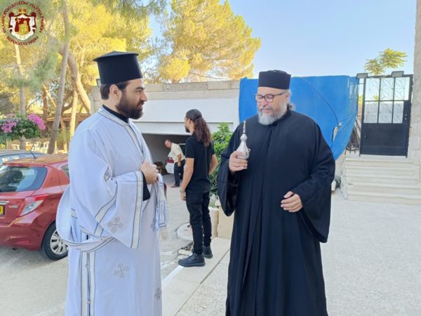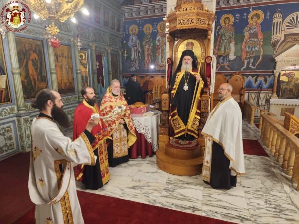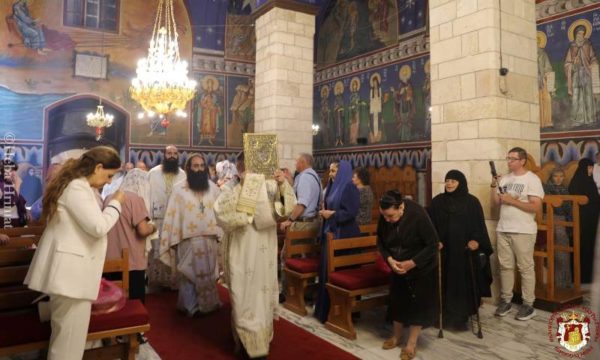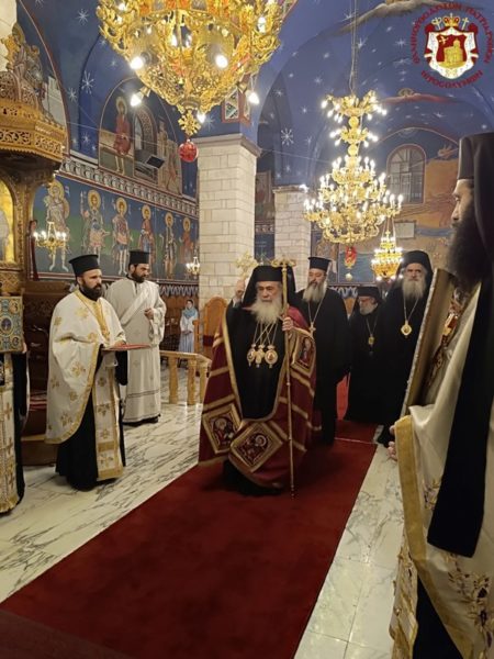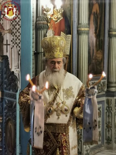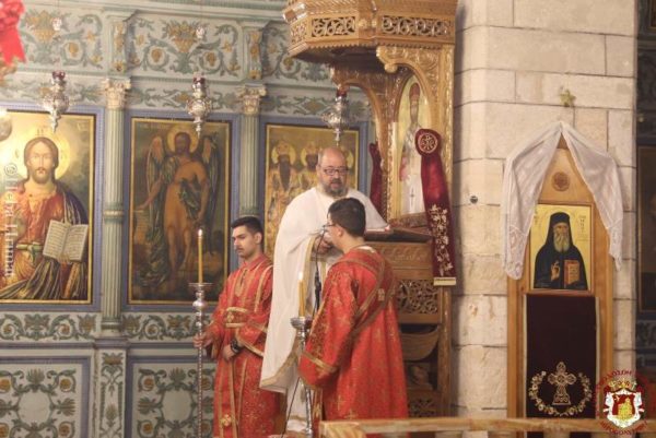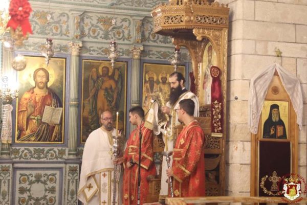 Vespers was celebrated in the evening by His Eminence Archbishop Theodosios of Sebastia, with the co-celebration of Archimandrite Bartholomew, the ministering Priests of Saint James Cathedral and Hierodeacon Dositheos. In the morning the Divine Liturgy was presided over by H.H.B. our Father and Patriarch of Jerusalem Theophilos, with the co-celebration of their Eminences, Metropolitan Hesychios of Capitolias, and the Archbishops Theodosios of Sebastia and Filoumenos of Pella, Holy Sepulchre Hieromonks and local Priests. The chanting was delivered by Hierodeacon Simeon on the right in Greek with the help of Saint Sabba’s monks and Saint James’ choir under Rimon Kamar on the left in Arabic. The service was attended by the Spiritual Father of the Holy Monastery of Saint Sabba, the Consul General of Greece in Jerusalem, Mr Dimitrios Angelosopoulos, the parishioners of Saint James and Arabic-speaking and Russian-speaking believers from Jerusalem, Bethlehem and other towns in the region.