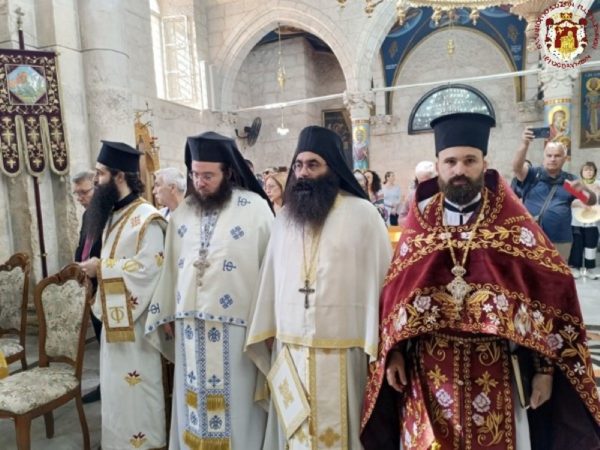In this Basilica, the celebration of the repatriation of the holy relics of Saint George took place during Vespers in the evening, presided over by the Most Reverend Metropolitan Joachim of Helenoupolis. The Divine Liturgy in the morning was officiated by our Father and Patriarch of Jerusalem Theophilos, along with their Eminences, the Archbishop Aristarchos of Constantina, the Metropolitan Joachim of Helenopolis and the Archbishop Aristovoulos of Madaba, the Archimandrites; Nectarios, Ieronymos, Niphon, and Christodoulos, Priest Hader Baramki, Archdeacon Mark and the Hierodeacons Eulogios and Dositheos. The chanting was delivered by the Community Byzantine choir as the service was attended by pious people who came despite the warlike situation. The service was also attended by the Ambassadors of Serbia and Albania to Israel.
