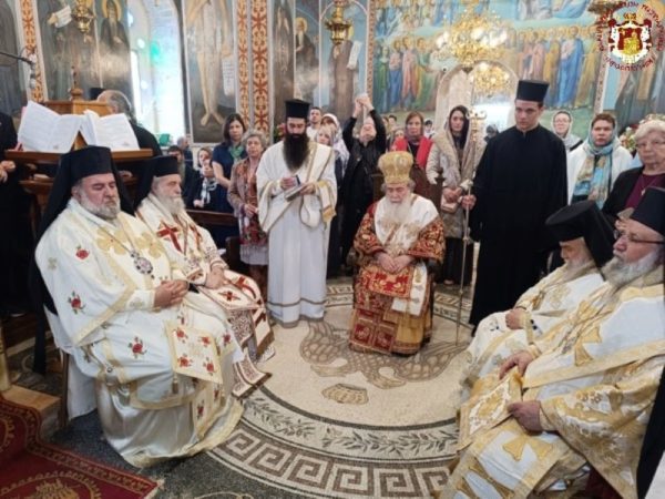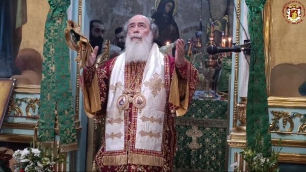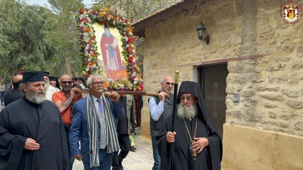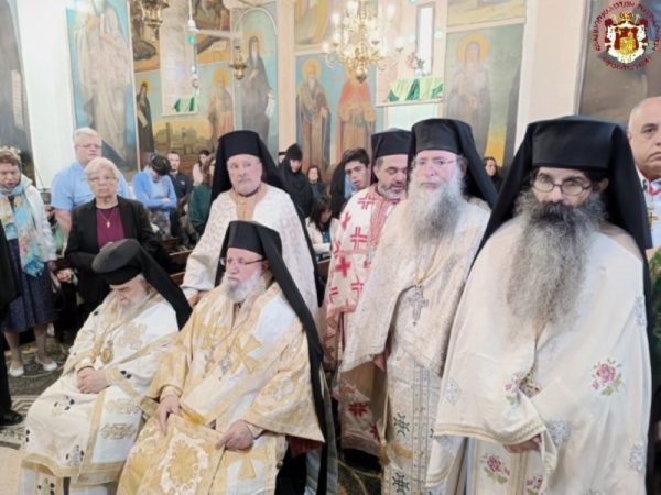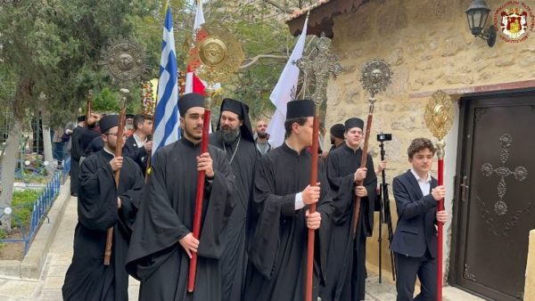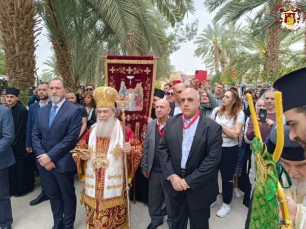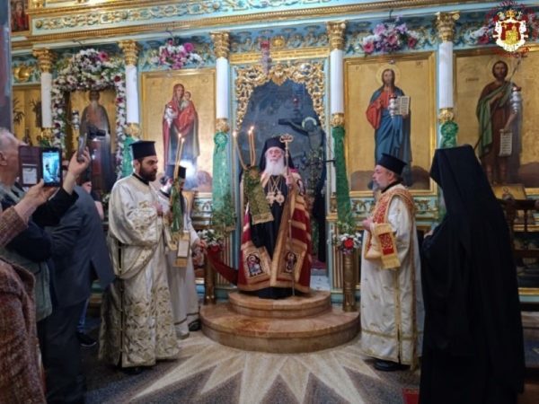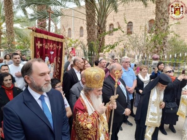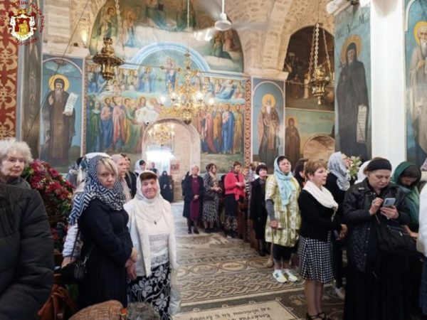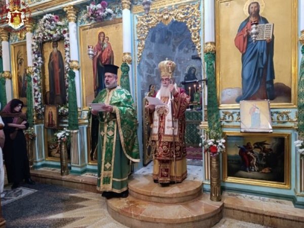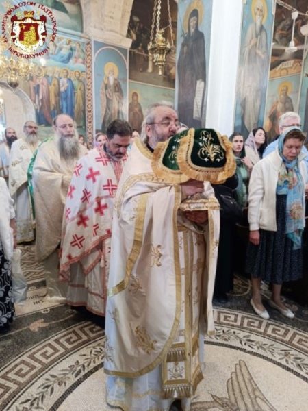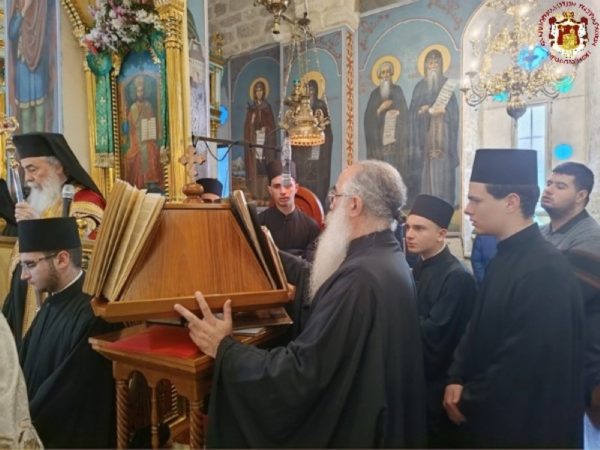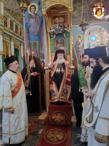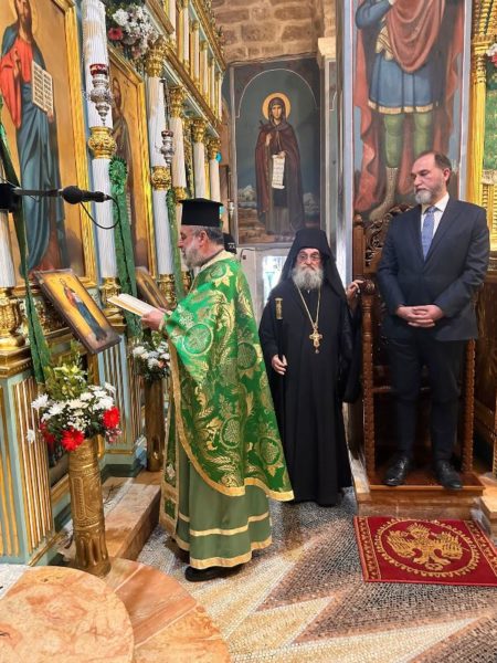 At the Holy Church of the Monastery, His Beatitude our Father and Patriarch of Jerusalem Theophilos celebrated the Divine Liturgy with the co-celebration of their Eminences, Metropolitan Isychios of Kapitolias, the Archbishops Aristarchos of Constantina, Nectarios of Anthedona, Philoumenos of Pella, the Elder Dragoman Archimandrite Mattheos, the Exarch in Moscow Archimandrite Stephanos, the Exarch in Athens Archimandrite Raphael, Archimandrites, Amphilochios, Claudius, Ieronymos and Kyriakos, other Priests, Archdeacon Mark and Hierodeacons Eulogios and Dositheos. The chanting was delivered by His Eminence Archbishop Aristovoulos of Madaba and the Patriarchal School students, as the service was attended by local faithful and pilgrims from Cyprus and the Consul General of Greece in Jerusalem Mr Dimitrios Angelosopoulos.