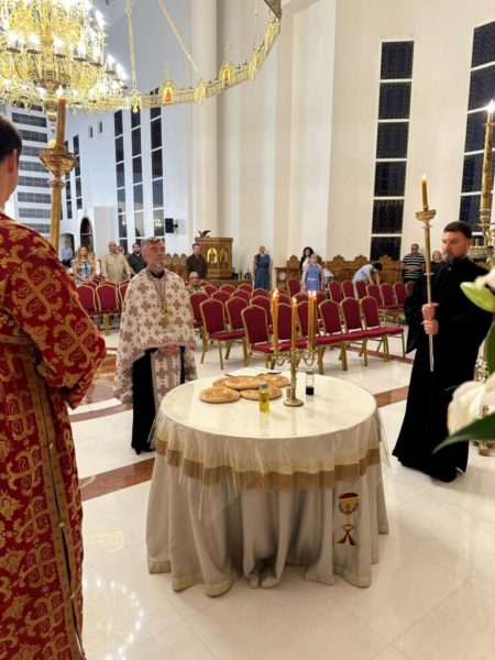 On Thursday, October 10, 2024, the great solemn Vespers was presided over by the Most Reverend Archbishop Makarios of Qatar, with the blessing of bread. The hymns were sung by the choir of the Holy Church in Arabic, Greek, and Slavonic. After the end of Vespers, a pre-festal banquet was held, attended by the clergy and members of the flock.