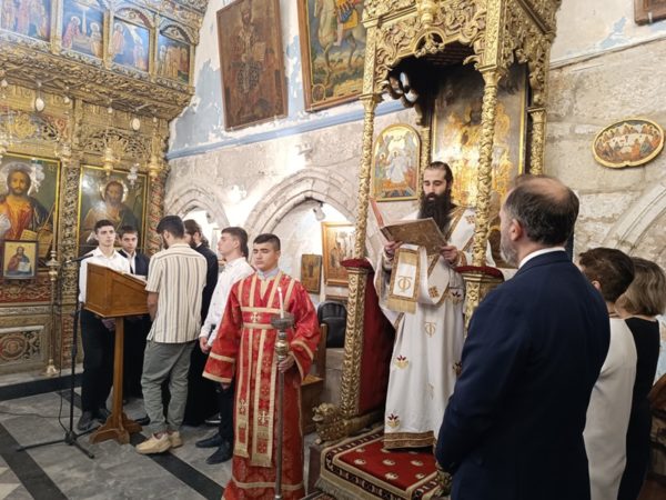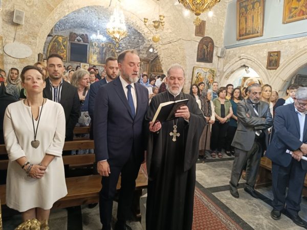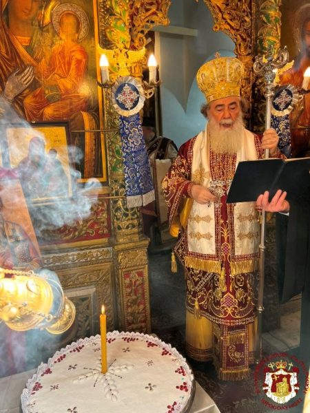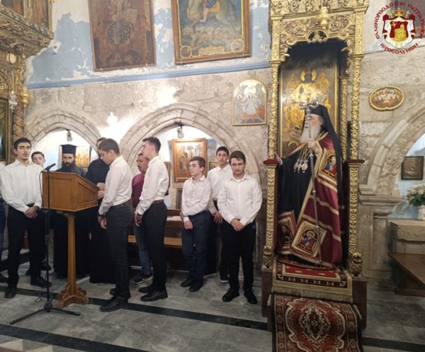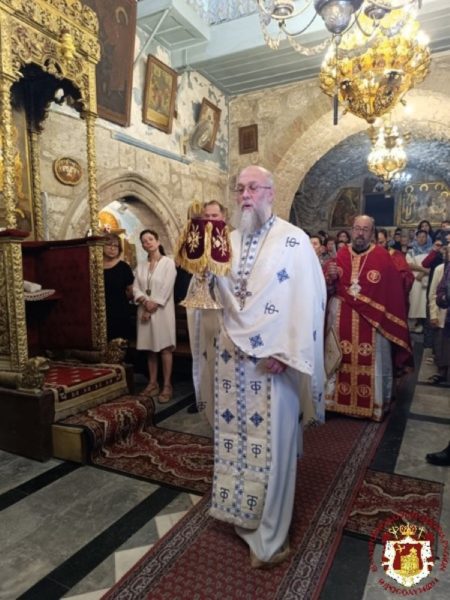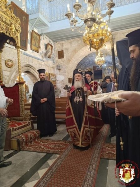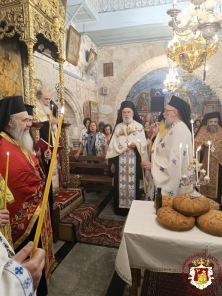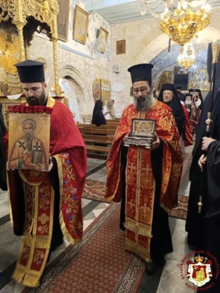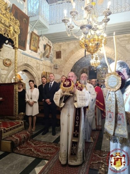 In his honour, in the Cathedral named after him, adjacent to the Holy Sepulchre Brotherhood and the Church of the Resurrection, Vespers was held in the evening, presided over by our Father and Patriarch of Jerusalem Theophilos and the Divine Liturgy in the morning, concelebrated by their Eminences; Metropolitan Isychios of Kapitolias and the Archbishops Aristarchos of Constantina and Philomenos of Pella, Holy Sepulchre Hieromonks, the Elder Kamarasis Archimandrite Nektarios, the ministering Priests of Saint James Cathedral, Fr Farah Badour and Fr Hader Baramki. The chanting was delivered by Hierodeacon Simeon with the students of the Patriarchal School of Zion on the right in Greek and by the choir of the Church under Mr Rimon Kamar on the left in Arabic. The service was attended by the congregation of the Orthodox Community of Jerusalem, monks, nuns and a few remaining pilgrims, in the presence of the Consul General of Greece in Jerusalem Mr Dimitrios Angelosopoulos and members of the Greek Consulate General in Jerusalem.