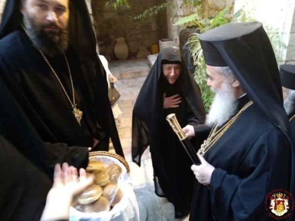 After the end of the Divine Liturgy, the full congregation went up to the Patriarchate Hall through the historic steps of Saint James carrying the Holy Icon of Saint James, passing through the Gate of the Patriarchate, where they received the ceremonial loaf of bread as a blessing by Nun Serafima, who is in charge of the Patriarchate’s bakery.