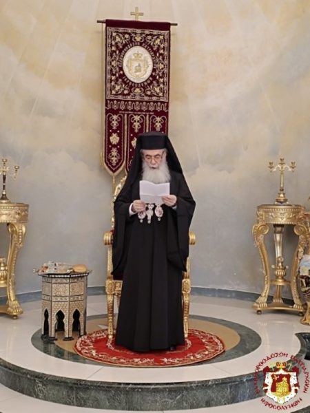 Today’s institutional celebration of the Throne and of the holy memory of the holy glorious Apostle James the Brother of God and first Hierarch of the Church of Jerusalem is an undeniable testimony of the ongoing Apostolic succession, of the one imprinted on the face of each Primate of the Church of Jerusalem for one; and of the unceasing prayerful presence of the mission of the order of the Studious, of our Venerable Holy Sepulchre Brotherhood, as well as of our devout Roman-Orthodox flock rooted and living in the Holy Land on the other hand.
