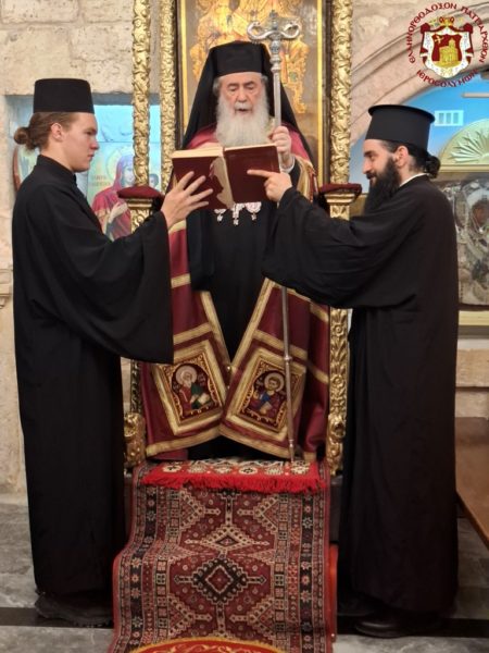 For this cause, accompanied by the honourable Holy Sepulchre Fathers and our brethren the Hierarchs, priests, hieromonks, and deacons, we went to the holy Church bearing his name, which stands adjacent to the Church of the Holy Sepulchre. There we celebrated a Patriarchal Divine Liturgy and offered unto the Holy Triune God—Who granted unto us His just disciple and Apostle, as well as Hierarch, good Shepherd, teacher, and faithful steward of the spiritual Mysteries—our thanksgiving prayers.