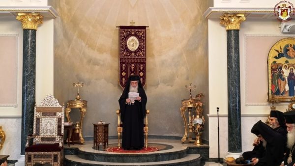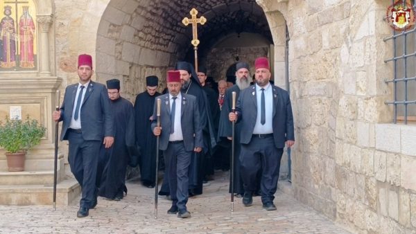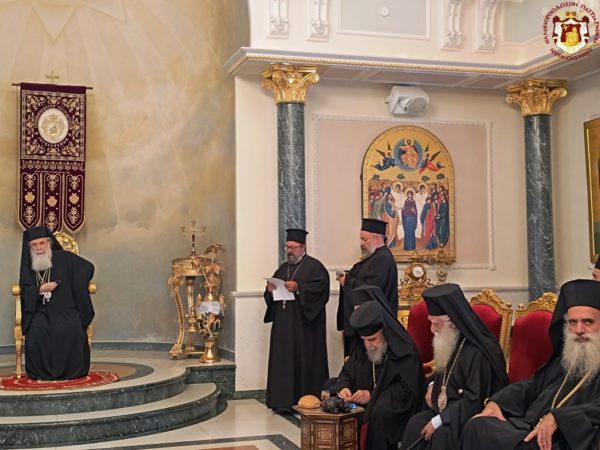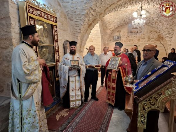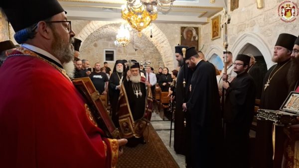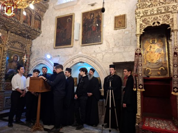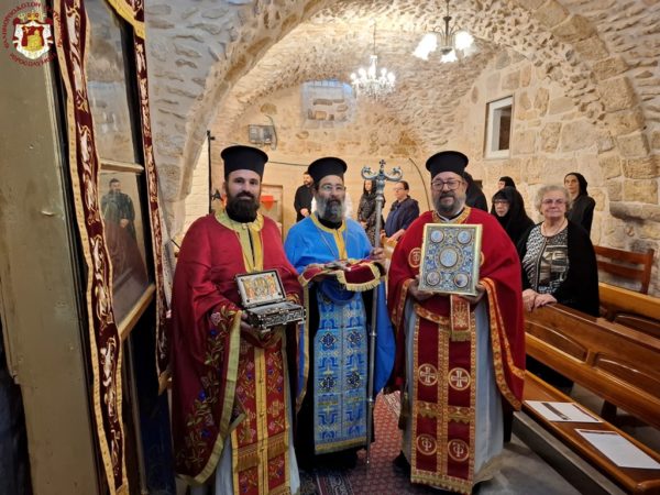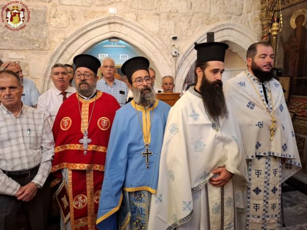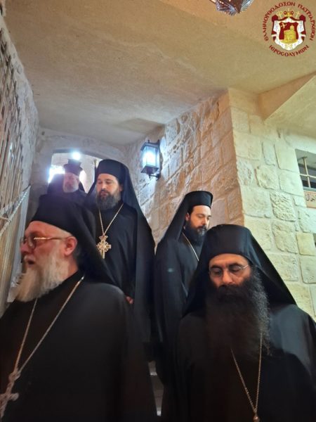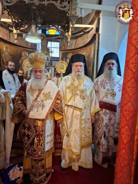 For this cause, accompanied by the honourable Holy Sepulchre Fathers and our brethren the Hierarchs, priests, hieromonks, and deacons, we went to the holy Church bearing his name, which stands adjacent to the Church of the Holy Sepulchre. There we celebrated a Patriarchal Divine Liturgy and offered unto the Holy Triune God—Who granted unto us His just disciple and Apostle, as well as Hierarch, good Shepherd, teacher, and faithful steward of the spiritual Mysteries—our thanksgiving prayers.