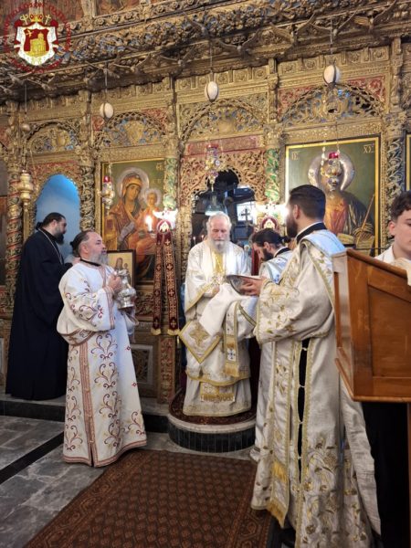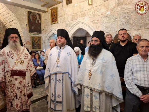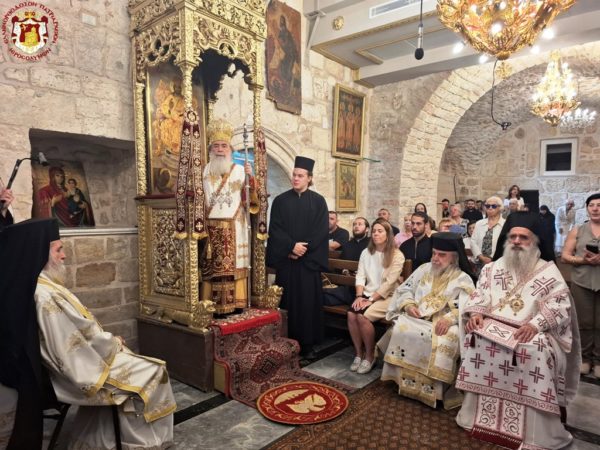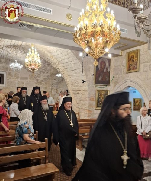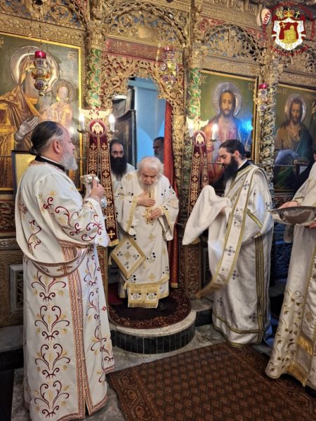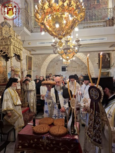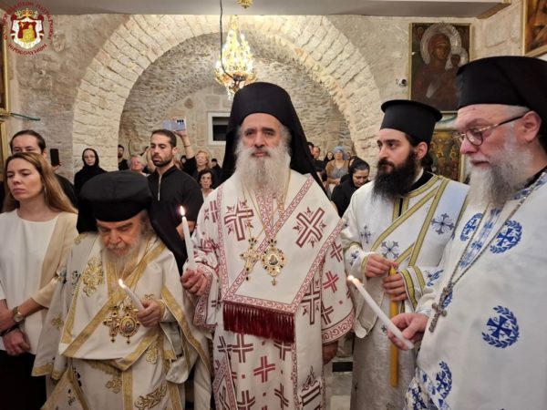 On the morning of the feast, the Divine Liturgy was presided over by His Beatitude our Father and Patriarch of Jerusalem, Theophilos, concelebrated by His Eminence Metropolitan Isychios of Capitolias, His Eminence Archbishop Aristarchos of Constantina, and His Eminence Archbishop Theodosios of Sebastia, together with Hieromonks of the Holy Sepulchre Fathers — among whom first was the Elder Kamarasis, Archimandrite Nektarios — and the priests of the holy Church, Priests George, Charalambos, and Nektarios.