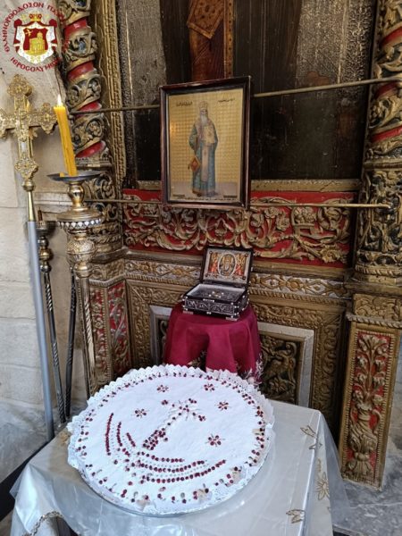 In honour of him as a hieromartyr, Great Vespers was presided over by His Beatitude our Father and Patriarch of Jerusalem, Theophilos, with concelebration by Hieromonks of the Holy Sepulchre Fathers and by the priests of the holy Church, Priests Charalambos Bandour and George Baramki, together with reverent faithful of Jerusalem participating devoutly.