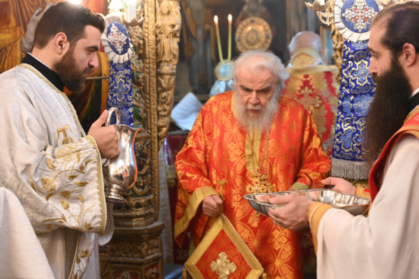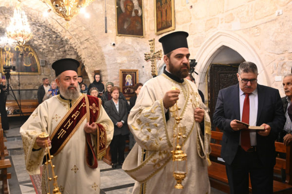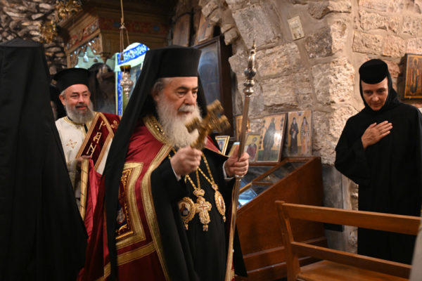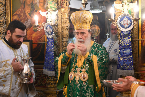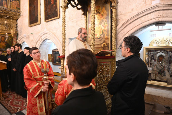 On the morning of the feast, the Divine Liturgy was officiated by His Beatitude, with con-celebrants their Eminences, Metropolitan Kyriakos of Nazareth, the Archbishops Aristarchos of Constantina, Theodosios of Sebastia, and Aristovoulos of Madaba, Holy Sepulchre Hieromonks, the Ministering Priests of the Cathedral, Archimandrite Vassianos from MISSIA with his Hierodeacon, Archdeacon Mark and Hierodeacons Eulogios and Dositheos. The chanting was delivered by Hierodeacon Simeon and Mr. Eustathios Tsoumanis in Greek and by the Cathedral Byzantine Choir under Mr Rimon Kamar in Arabic, as the service was attended by the parish members and others from Jerusalem, with the honorary presence of Mrs Constantina Gyftou from the Greek Consulate General of Jerusalem.