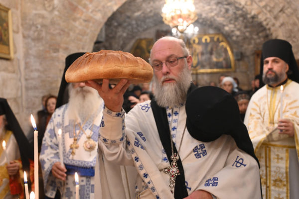At the end of the Divine Liturgy, His Beatitude with the High Priests and Priests co-celebrating with Him, dressed up, ascended the steps of Saint James Cathedral and met with the other Holy Sepulchre High Priests and Hieromonks in the forecourt of the Holy Church of Saints Constantine and Helen, and chanting in the joy of the resurrected Christ, went up to the Patriarchate Hall for the Dismissal. At the entrance of the Central Monastery, nun Seraphima, the head of the Bakery and Abbess of the Holy Monastery of Panagia Sayda Naya, offered the established small loaves of bread of blessing in honour of the feast of the Throne of the Patriarchate of Jerusalem.