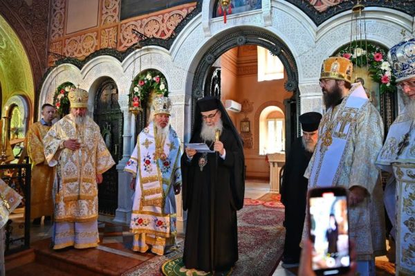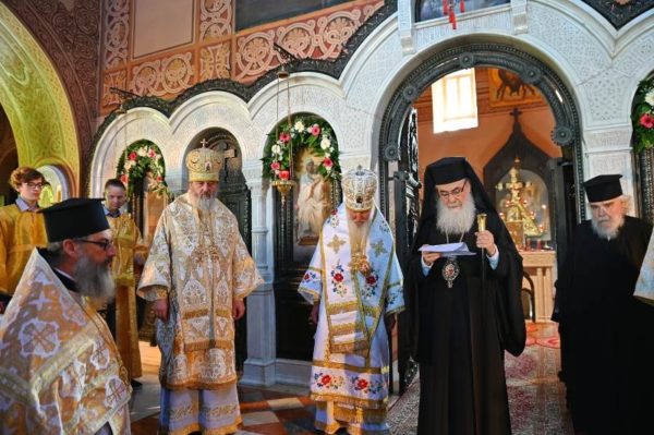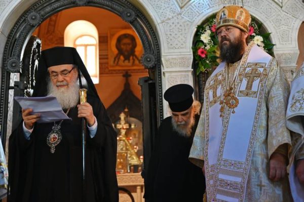 During the Divine Liturgy in this Monastery, which was presided over by the Metropolitan of Berlin, His Eminence Mark, with two High Priests of the Russian Orthodox Church of the former diaspora, their Eminences Irenaeus and Theodosios, and Priests of the same Church. H.H.B. our Father and Patriarch of Jerusalem Theophilos visited the Monastery and presented an icon to Metropolitan Mark and a cross of blessing to the Abbess Nun Elizabeth and spoke in English.