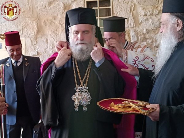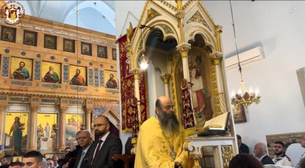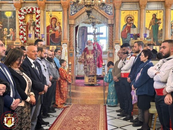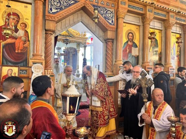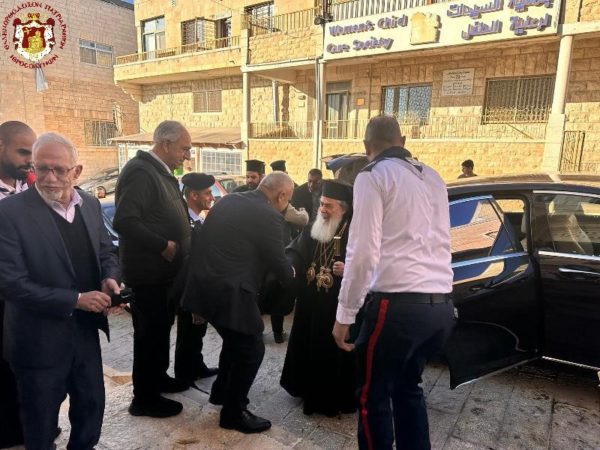 At the town of Beit Jala, at the marvellous Church of Saint Nikolaos. The Divine Liturgy was presided over by H.H.B. our Father and Patriarch of Jerusalem Theophilos, with the co-celebration of their Eminences, the Archbishops Aristarchos of Constantina and Theodosios of Sebasteia, Archimandrite Nectarios, the Hegoumen of the H. Monastery of Saint George Al Khader Archimandrite Porphyrios, the Priests Boulos, Yusef and Elias and other Priests of the area and Hierodeacon Eulogios. The Service was attended by the full congregation of the town, the representative of the Greek Consulate General in Jerusalem Mrs Constantina Gyftou, and the representatives of the Palestinian State, Mr Houloud Dagiebes and Mr Riyad Hananie, and the Hegoumen of Beit Jala Archimandrite Ignatios who was responsible for the organization of the feast.