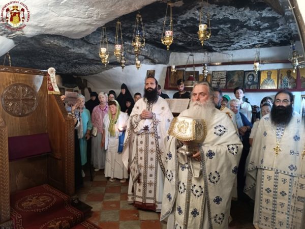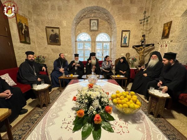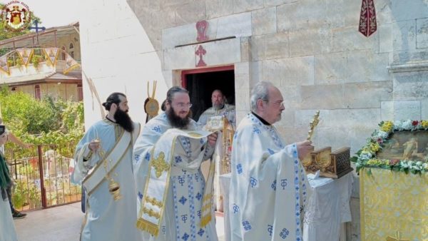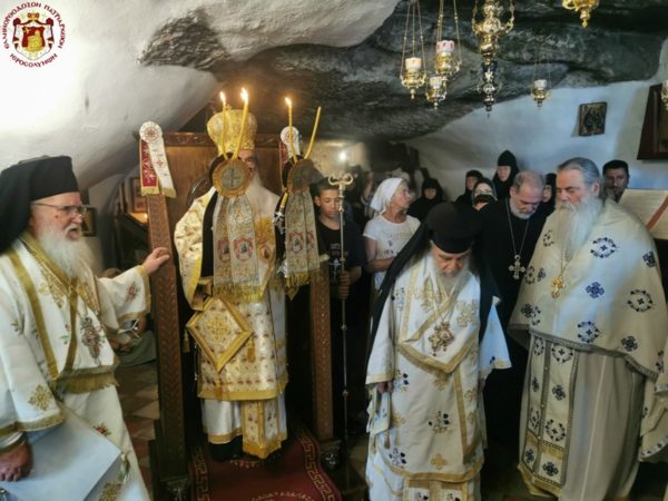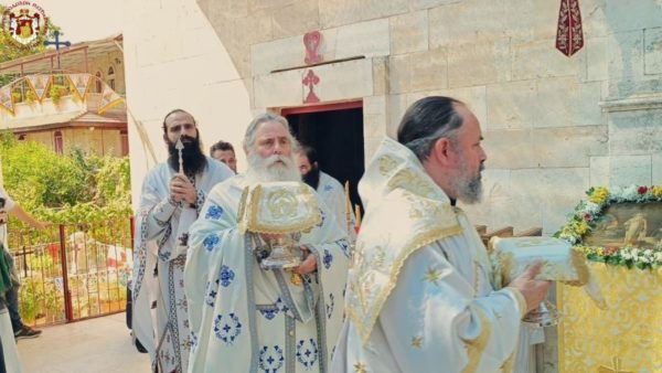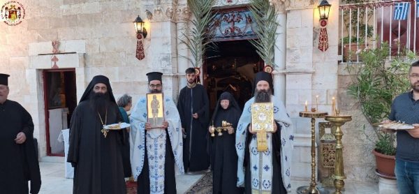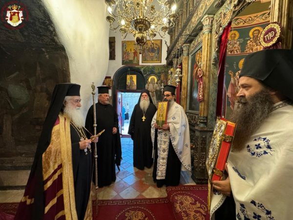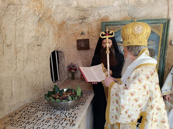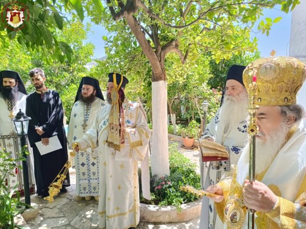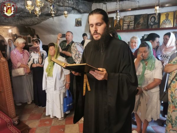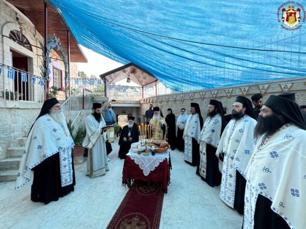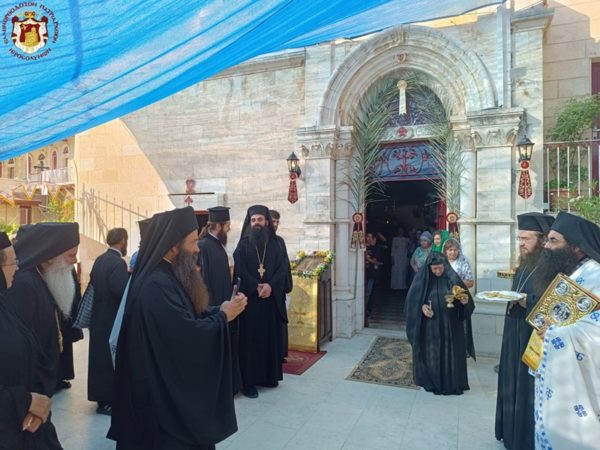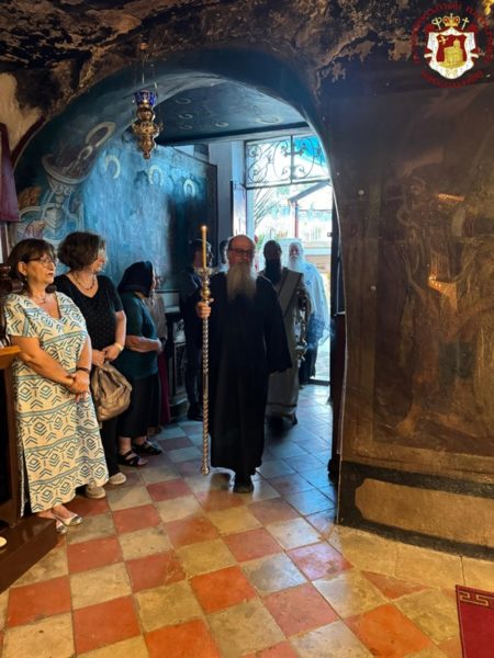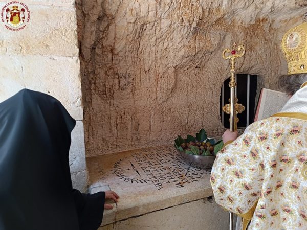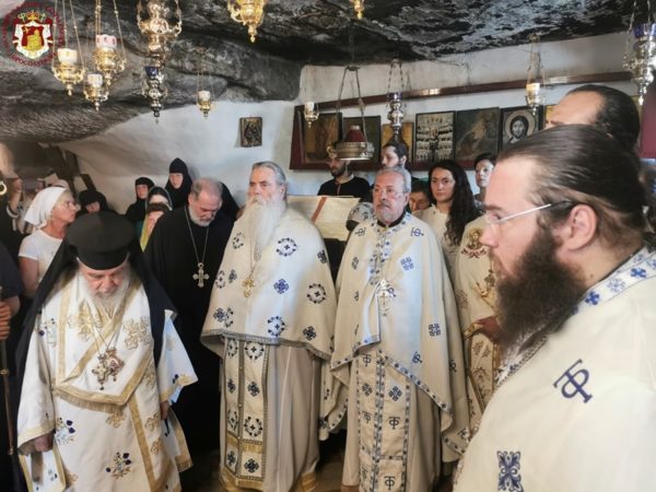 On this day, the Church remembers that the holy Onuphrius lived initially in the Coenobitic monastery of Hermoupolis and then went to the desert and lived there for sixty years with extreme fasting and prayer, even without clothing. The monk Paphnutius found him in this condition, who also revealed him to the Church and buried him there covering him with his garment. On his memory and in this place, the Divine Liturgy was celebrated by H.H.B. our Father and Patriarch of Jerusalem Theophilos, with concelebrants their Eminences, Metropolitan Kyriakos of Nazareth and Archbishop Aristarchos of Constantina, the Hegoumen of the Oblou Monastery Archimandrite Nektarios, Archimandrites Claudios, Ieronymos, Silouanos and Christodoulos, Archdeacon Markos, and Hierodeacon Dositheos. Hierodeacon Simeon and Mr Eustathios Tsoumanis delivered the chanting as the service was attended by faithful Orthodox Christians.