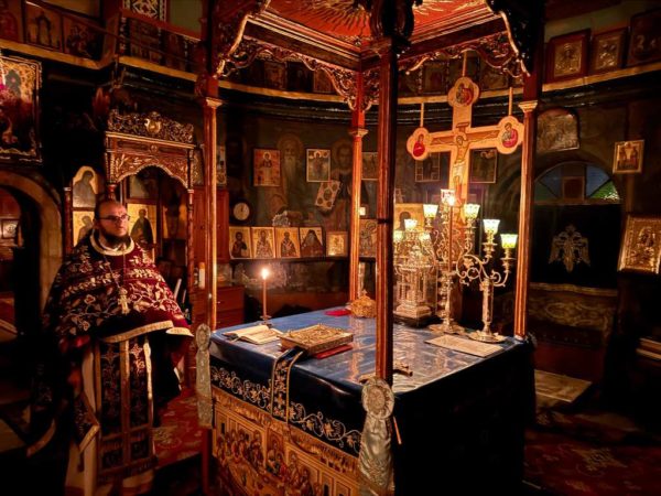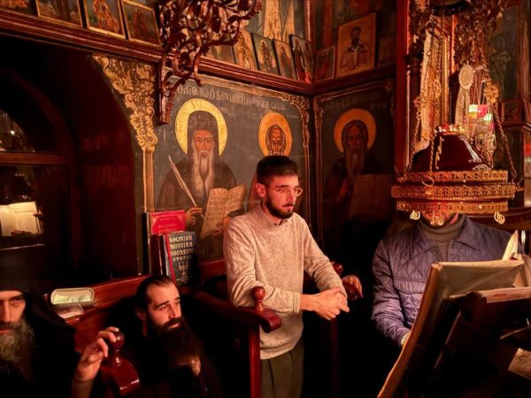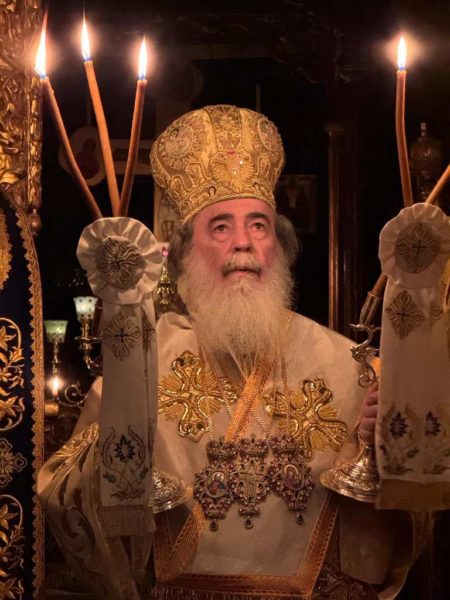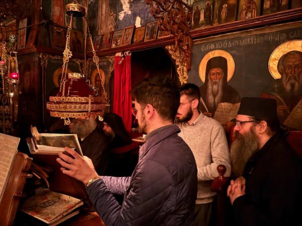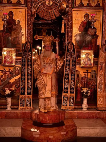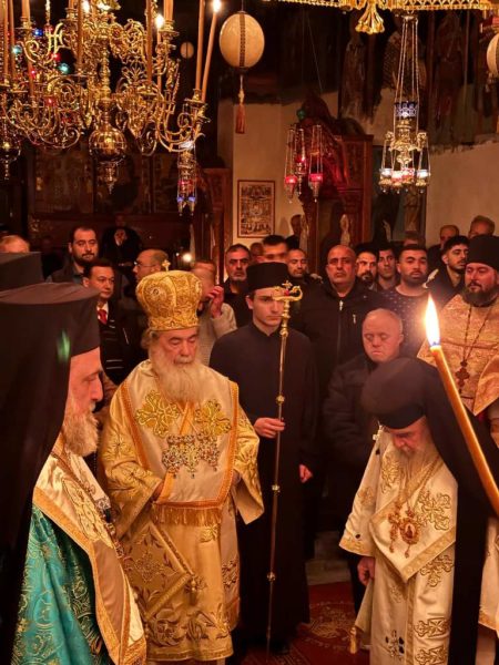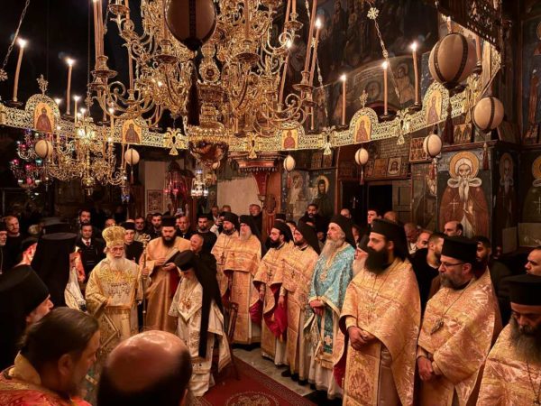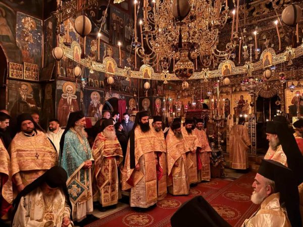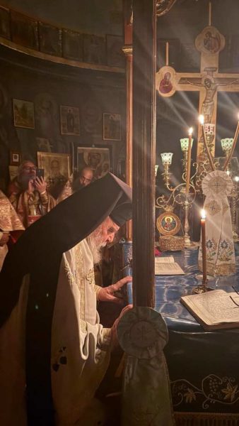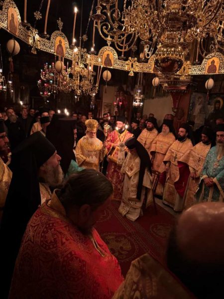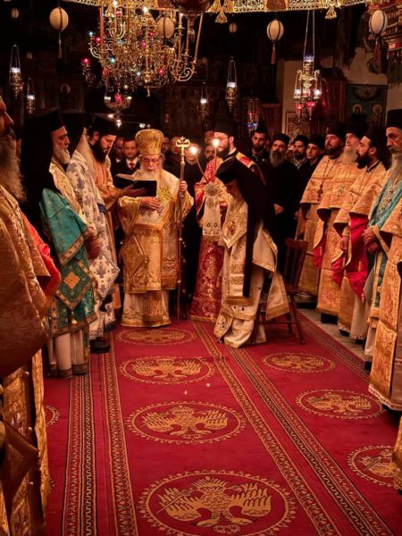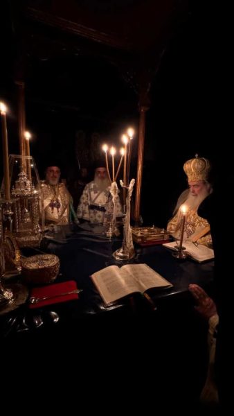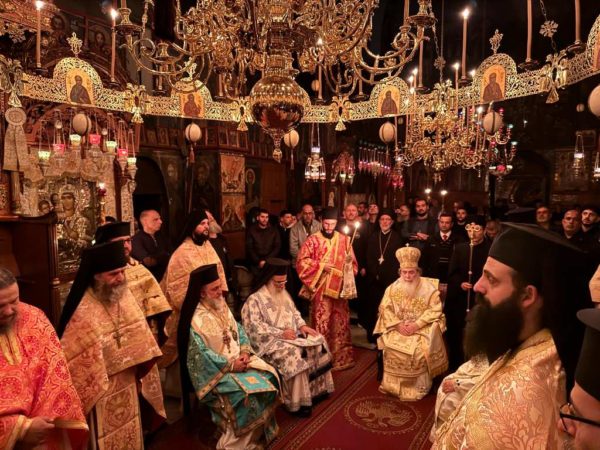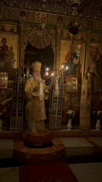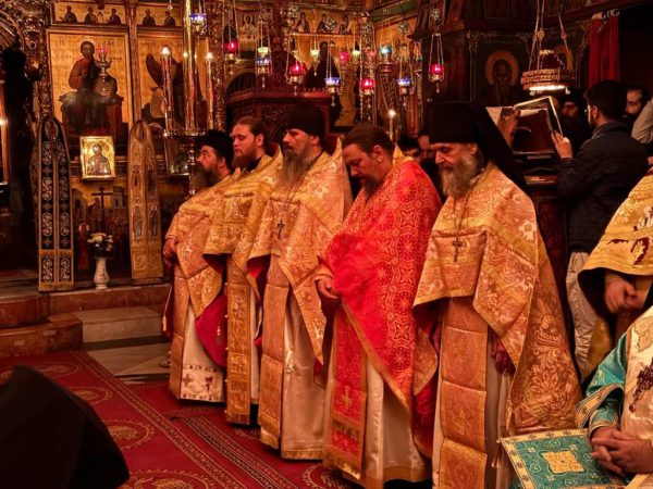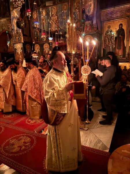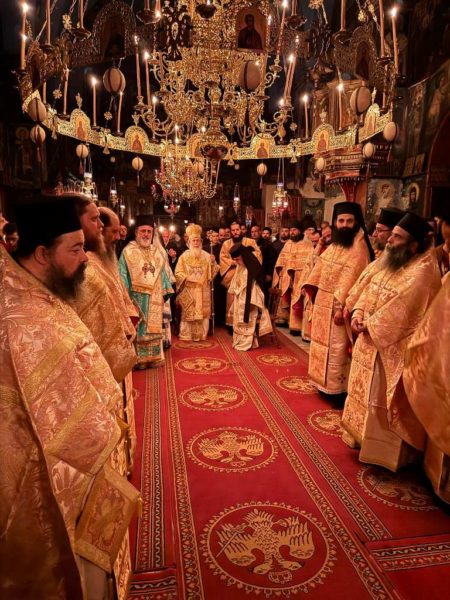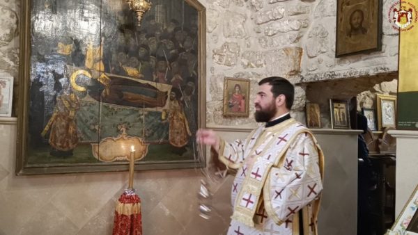 In his honour, an all-night vigil was held at his Holy Lavra, presided over by His Beatitude our Father and Patriarch of Jerusalem, Theophilos, with the participation of their Eminences, the Archbishops, Aristoboulos of Madaba, Aristarchos of Constantina,, and His Eminence Metropolitan Joachim of Helenoupolis, along with the Holy Sepulchre Hieromonks and Arabic- and Russian-speaking priests, with the choir of the Secretary of the Holy and Sacred Synod, Hierodeacon Simeon, chanting in Greek on the right side and the Arabic choir on the left.