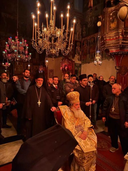 Therefore, we, who honour today the sacred memory of our blessed Father Sabbas, let us call upon him, that he, together with the intercessions of the Most Blessed Theotokos and Ever-Virgin Mary, may entreat the Lord our God for the salvation of our souls, for peace in our region, and that we may be counted worthy to celebrate the great and ineffable mystery of the divine Providence, the Nativity of our God and Saviour Christ in the Grotto of Bethlehem.