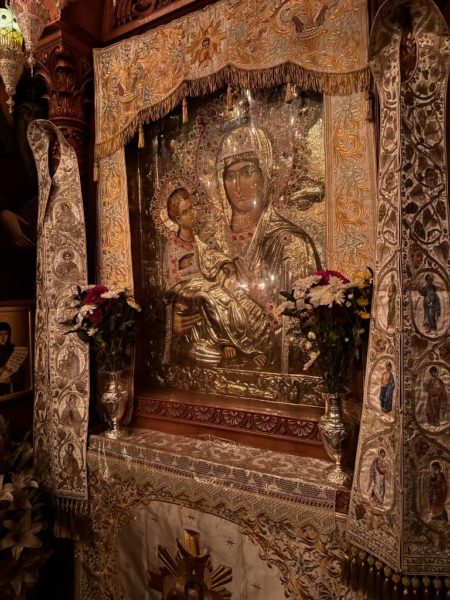 As the Patriarch departed, he passed through the Holy Monastery of Abba Theodosios the Coenobiarch, where he was received by the elderly Hegoumen, Archimandrite Hierotheos.