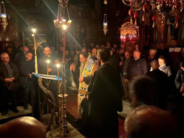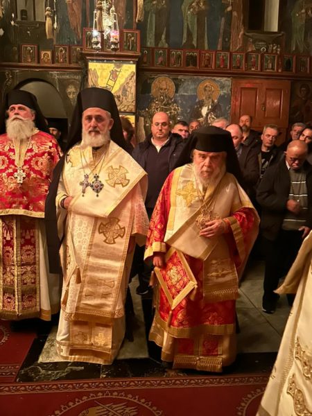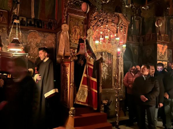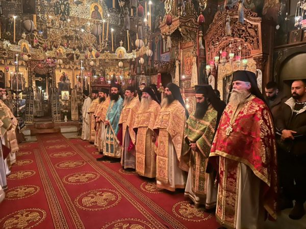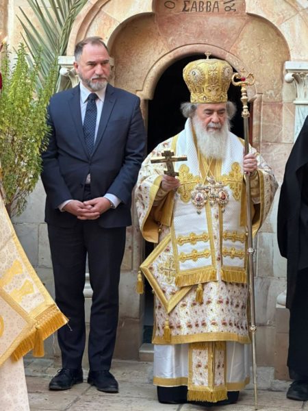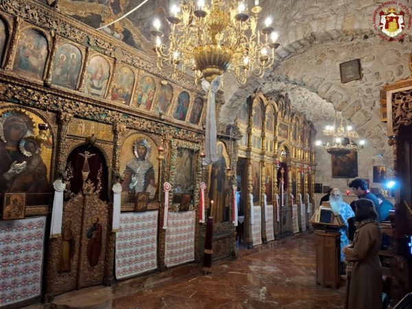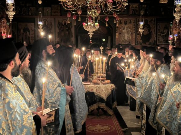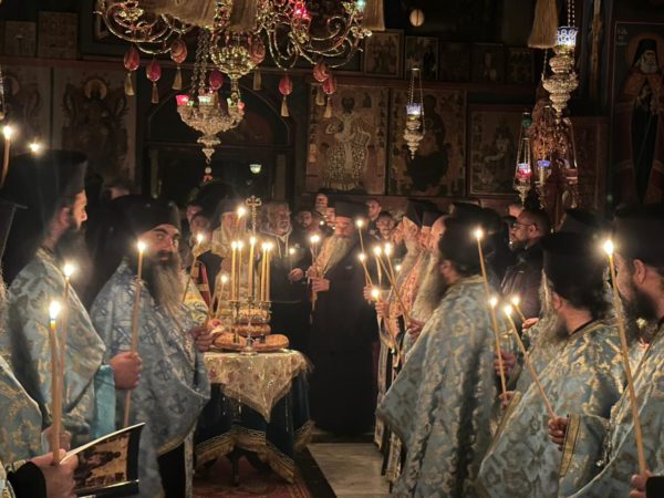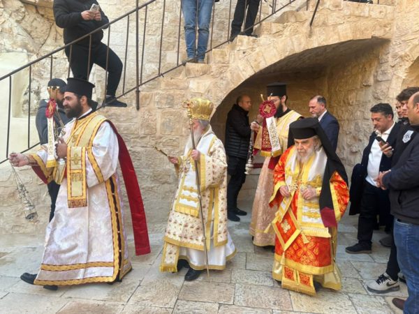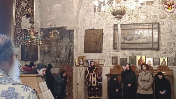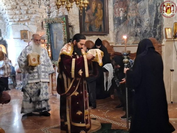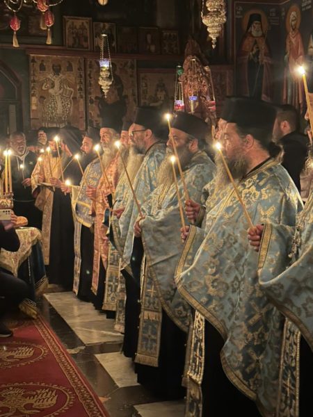 In honour of this luminary of the monastic life, an all-night vigil was celebrated at his Lavra, presided over by His Beatitude our Father and Patriarch of Jerusalem Theophilos. Concelebrating with him were the Elder Chief Secretary, His Eminence Archbishop Aristarchos of Constantina; His Eminence Metropolitan Makarios of Acre–Ptolemais, who was the presiding hierarch of the entire three-day feast; and His Eminence Metropolitan Joachim of Helenopolis, together with Holy Sepulchre hieromonks, including the Archimandrites Niphon, Markellos, and Dositheos; priests from the neighbouring regions of Beit Jala and Bethlehem; the representative of the Russian Ecclesiastical Mission in Jerusalem; the Archdeacon Mark; and the Hierodeacon Eulogios. The chanting was led by the chief cantor of the Church of the Holy Sepulchre, Deacon Efstathios, assisted by the Greek choir on the right and the Arabic-speaking choir on the left under Mr Elias. Faithful attended from Bethlehem, the Shepherds’ Field, and Beit Jala, in the presence of the Consul General of Greece in Jerusalem, Mr Dimitrios Angelosopoulos, and Mr Ypsilantis, under the care of the Spiritual Father of the Lavra, Archimandrite Eudokimos.