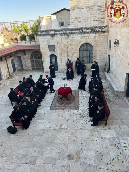Being grateful to these glorious founders of the “Order of the Spoudaioi (Studious)”, that is, our Holy Sepulchre Brotherhood on the one hand and to the originators of the Christ-like spiritual greatness of Romiosyni on the other, we celebrated a Patriarchal Divine Liturgy in the Monastic Church of Saints Constantine and Helen and prayed to the Holy Triune God for peace in our region tested by the fire of war.