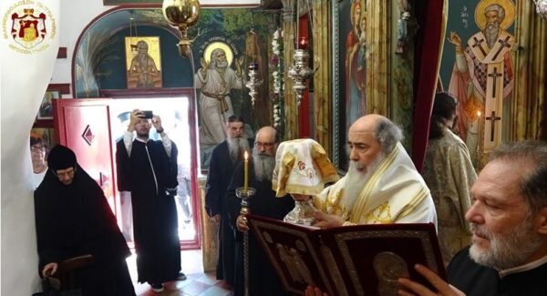 In this Church which has a part inside a cave, the Divine Liturgy was led by our Father and Patriarch of Jerusalem Theophilos, with co-celebrants the Most Reverend Archbishop Aristarchos of Constantina and the Most Reverend Metropolitan Joachim of Helenoupolis, Hagiotaphite Hieromonks, with first in rank Archimandrite Ignatios and Fr. Nectarios and Fr. Eirinaios, from the Holy Monastery of Oblou, of the Holy Metropolis of Patra from the Church of Greece, Archdeacon Mark and Deacon Sophronios, at the presence of a large congregation of pilgrims, monks and nuns.