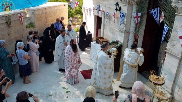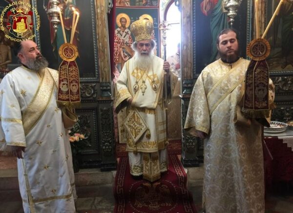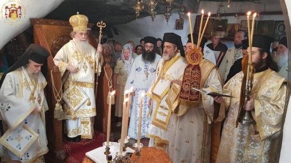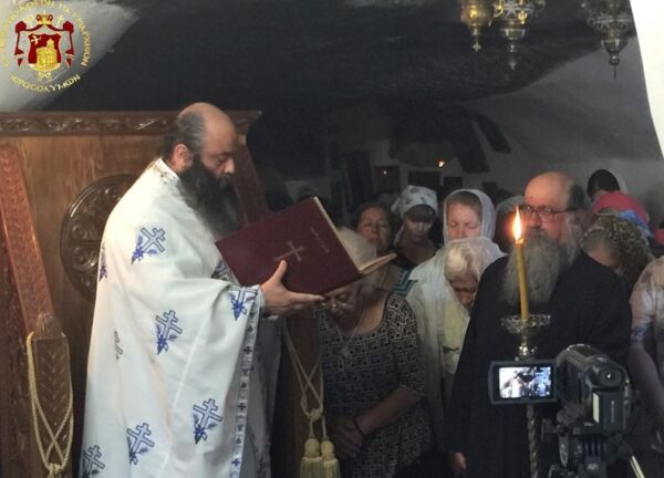 In this Church which has a part inside a cave, the Divine Liturgy was led by our Father and Patriarch of Jerusalem Theophilos, with co-celebrants the Most Reverend Archbishop Aristarchos of Constantina and the Most Reverend Metropolitan Joachim of Helenoupolis, Hagiotaphite Hieromonks, with first in rank Archimandrite Ignatios and Fr. Nectarios and Fr. Eirinaios, from the Holy Monastery of Oblou, of the Holy Metropolis of Patra from the Church of Greece, Archdeacon Mark and Deacon Sophronios, at the presence of a large congregation of pilgrims, monks and nuns.
