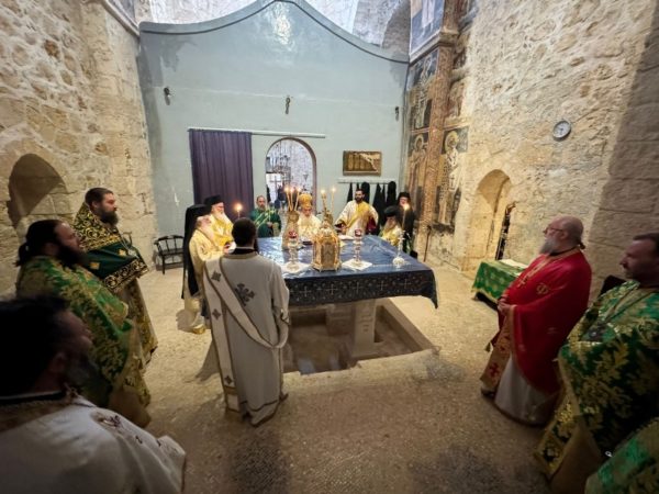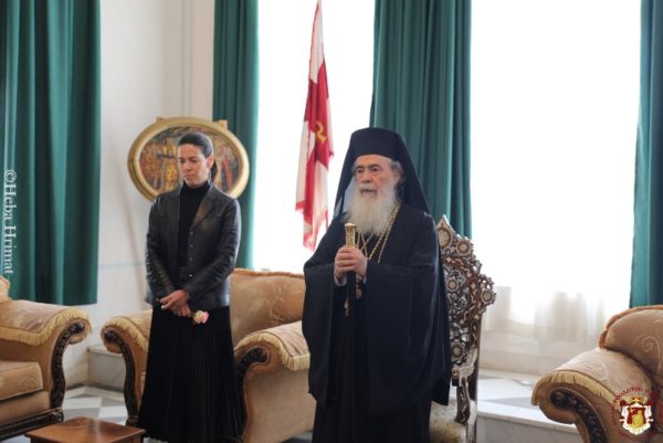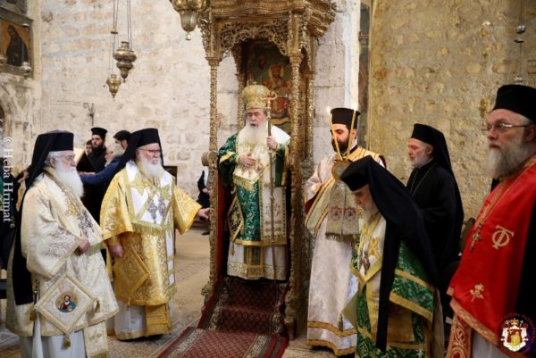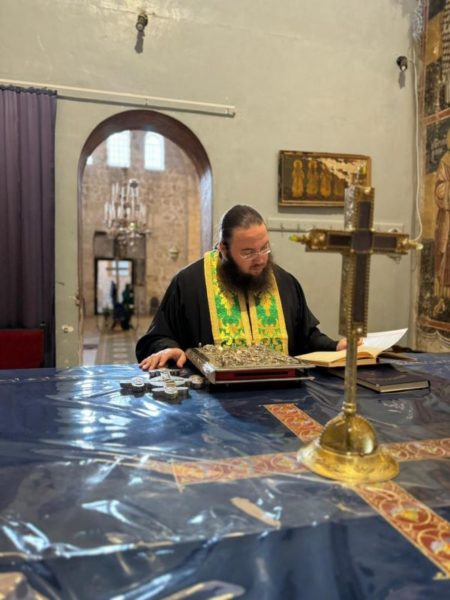 On this occasion, Vespers was celebrated on Saturday afternoon by Holy Sepulchre Hieromonks with Archimandrite Ieronymos first in rank. On Sunday morning the Divine Liturgy was officiated by H.H.B. our Father and Patriarch of Jerusalem Theophilos with the co-celebration of their Eminences, Metropolitan Kyriakos of Nazareth, the Archbishops, Aristarchos of Constantina and Methodios of Tabor, the Dragoman Archimandrite Mattheos, the Hegoumen in Madaba, Archimandrite Ieronymos, Priest Ioannis Antoniou and other Priests. The service was attended by the representative of the Greek Consulate General in Jerusalem Mrs Anna Mandika and monks, nuns and members of our flock.