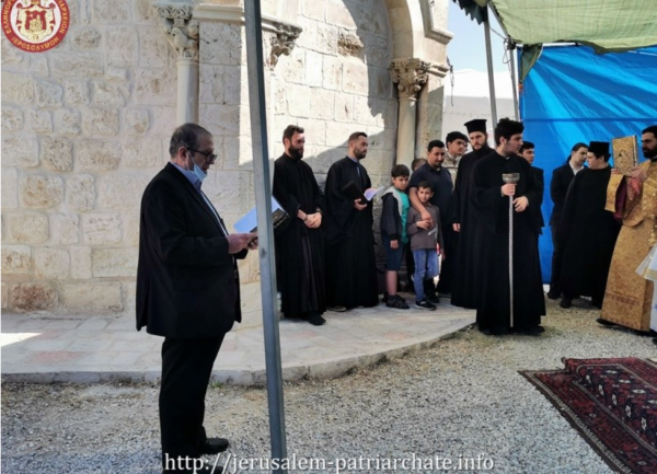 There, after the sanctification service of the Holy Altar, since it is an outdoor space, Vespers was held under the lead of His Eminence Archbishop Demetrios of Lydda, at the chanting of the Byzantine Choir Leader Hierodeacon Simeon and Secretary of the Holy and Sacred Synod, Mr. Vasilios Gotsopoulos with the help of the Patriarchal School of Zion students in Greek, and Mr. Rimon Kamar in Arabic. The Service was co-celebrated by Priests of St. James’ Cathedral and was attended by members of the Greek Consulate. Finally, the Service of the Compline was read, and a procession followed at the Monastery of Galili Viri, which marked the end of the Compline at the Shrine.