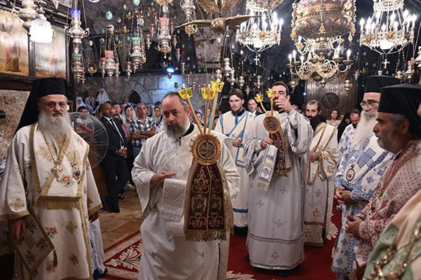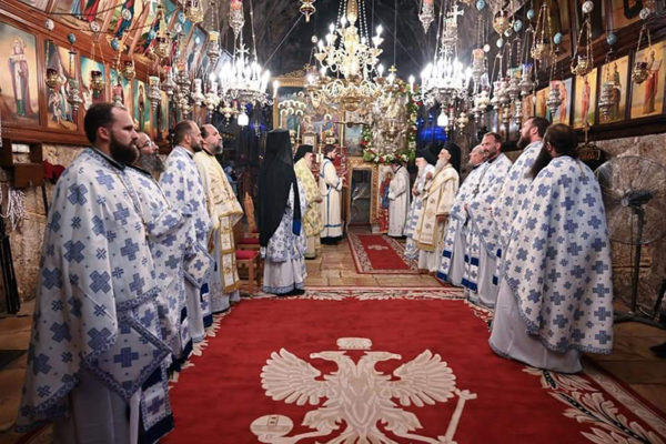 Today the Holy Church of Christ and the city of Jerusalem celebrate the solemn memory of the Dormition and Metastasis of our Most blessed Lady and Ever-Virgin Mary together with the angelic orders that accompanied her in the hands of her Son, as the hymnographer proclaims: “She that is higher than the Heavens, and more glorious than the Cherubim, and more honourable than all creation; she that because of her exceeding purity became the vessel of the everlasting Essence, today committeth her all-holy soul into the hands of her Son. With her, all things are filled with joy, and she granteth us great mercy” (Vespers, Entreaty, Troparion 2).