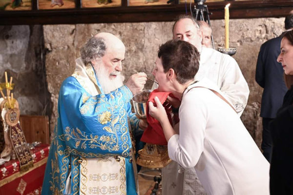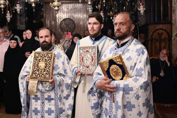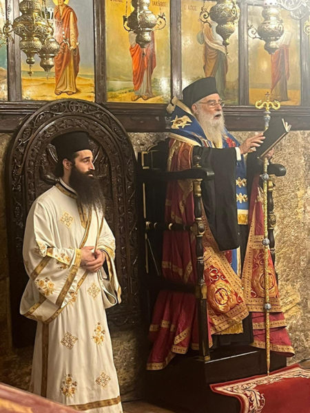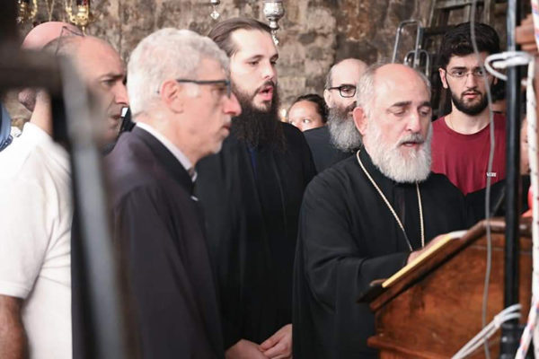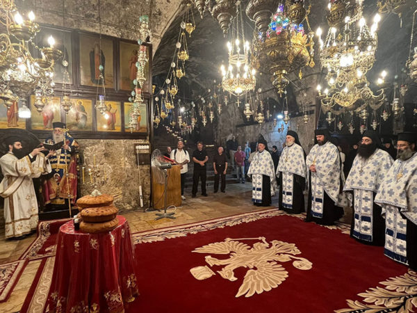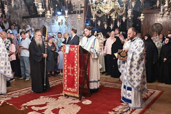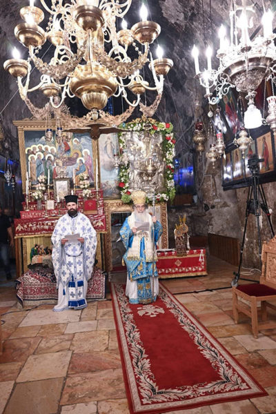In honour of the Dormition of the Theotokos, the Divine Liturgy at her Tomb was presided over by H.H.B. our Father and Patriarch of Jerusalem Theophilos, with con-celebrants their Eminences, the Metropolitans Hesychios of Capitolias and Timotheos of Bostra, the Archbishops, Theophanes of Gerash, Dimitrios of Lydda, Aristovoulos of Madaba, Holy Sepulchre Hieromonks and Priests, representatives of the Patriarchates of Romania and Russia, Archdeacon Mark and Hierodeacons Eulogios and Dositheos. The chanting was delivered by Hierodeacon Simeon with the help of the monks serving at the shrine in Greek and Saint James’ Byzantine choir in Arabic. The service was attended by the Consul General of Greece in Jerusalem Mr Dimitrios Angelosopoulos and members of the Consulate General, local faithful Christians and pilgrims.